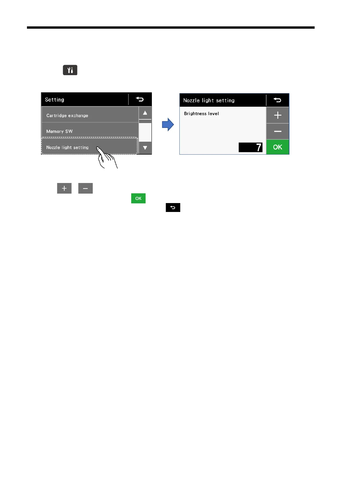 2. Touch “Nozzle light setting” to display the nozzle light setting screen.
