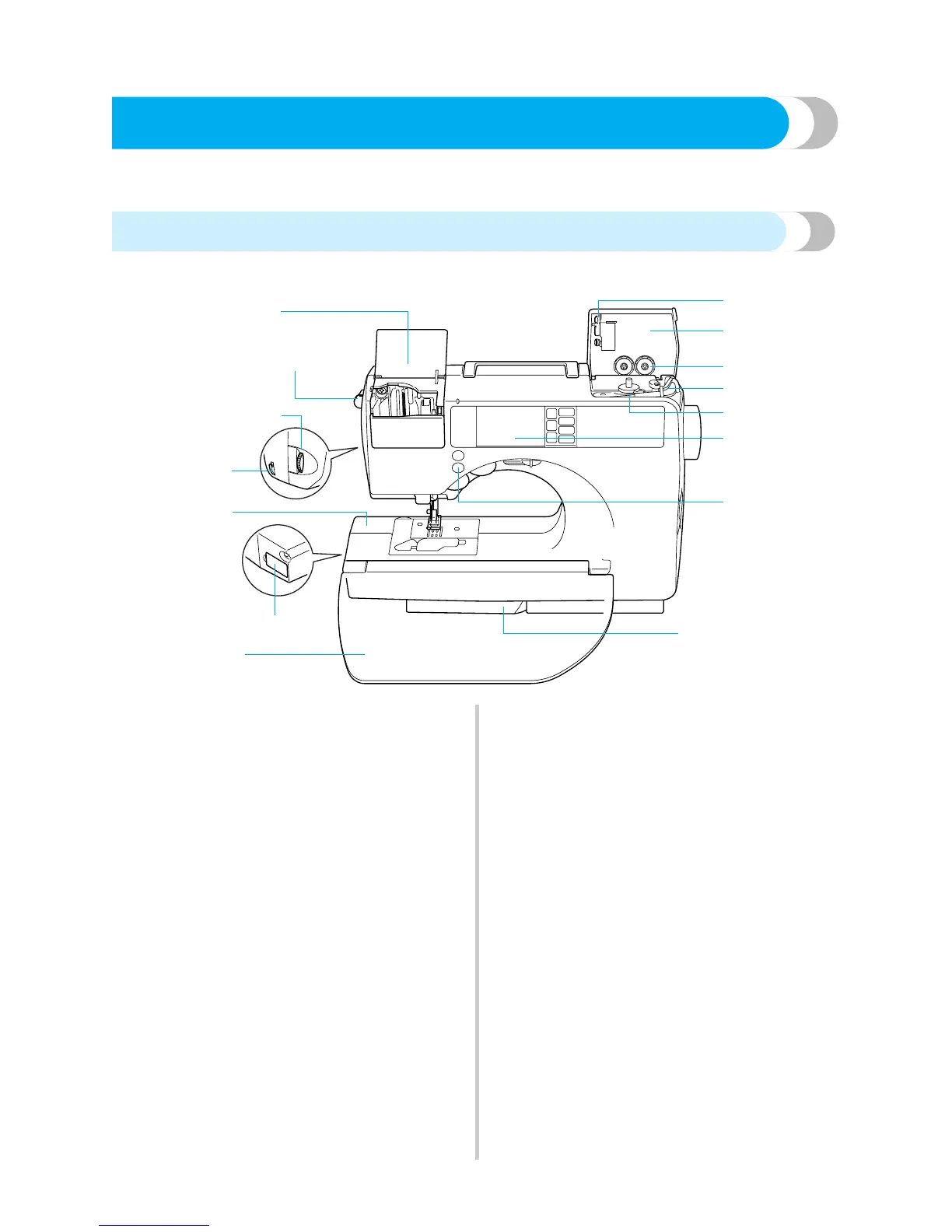 using the sewing machine, carefully read these descriptions to learn the names of the machine parts.