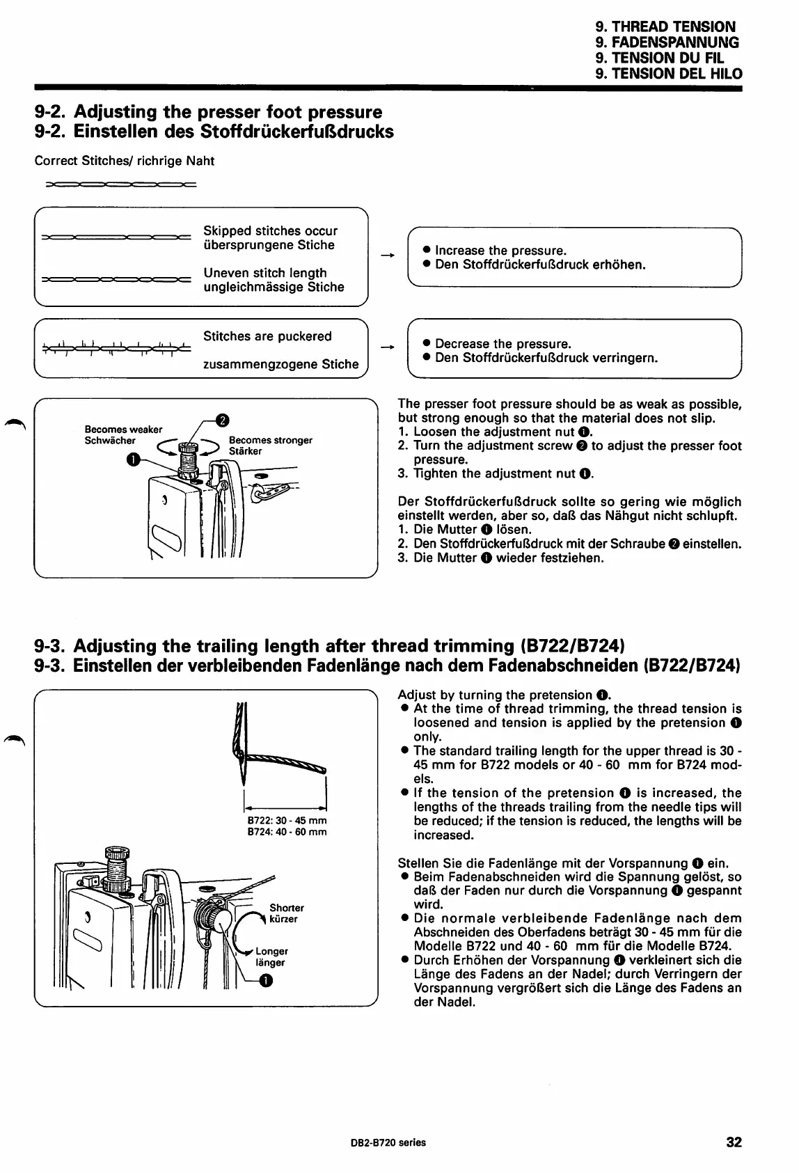 Brother DB2-B721 - Adjusting the Presser Foot Pressure; Adjusting the Trailing Length after Thread Trimming (B722;B724)