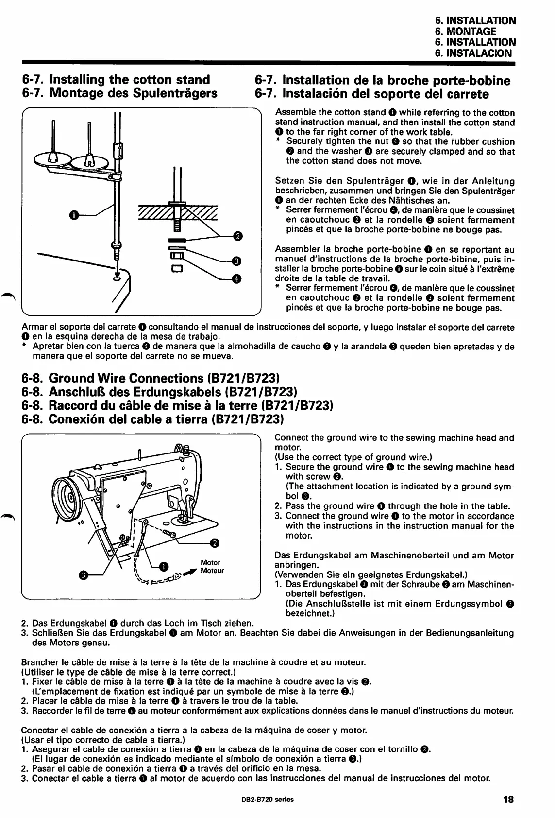 Brother DB2-B722 - Installing the Cotton Stand; Ground Wire Connections {B721;B723); Montage des Spulentragers; Installation de la Broche Porte-Bobine