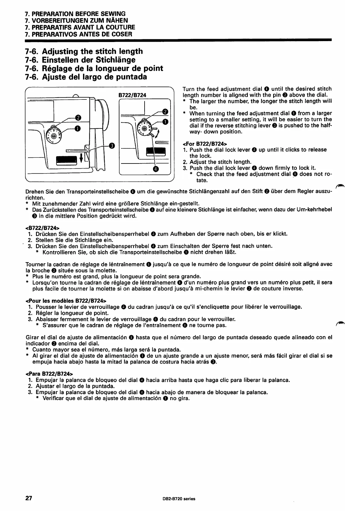 Brother DB2-B722 - Adjusting the Stitch Length; Einstellen der Stichlange; Reglage de la Longueur de Point