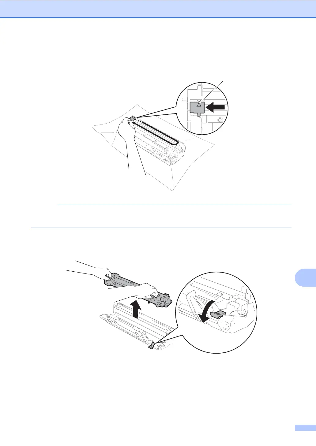 Push down the lock lever and take the toner cartridge out of the drum unit.