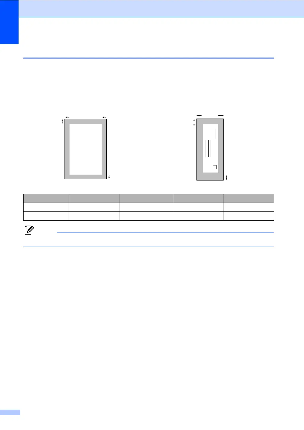 show the unprintable areas on cut sheet paper and envelopes. The machine can only print in the