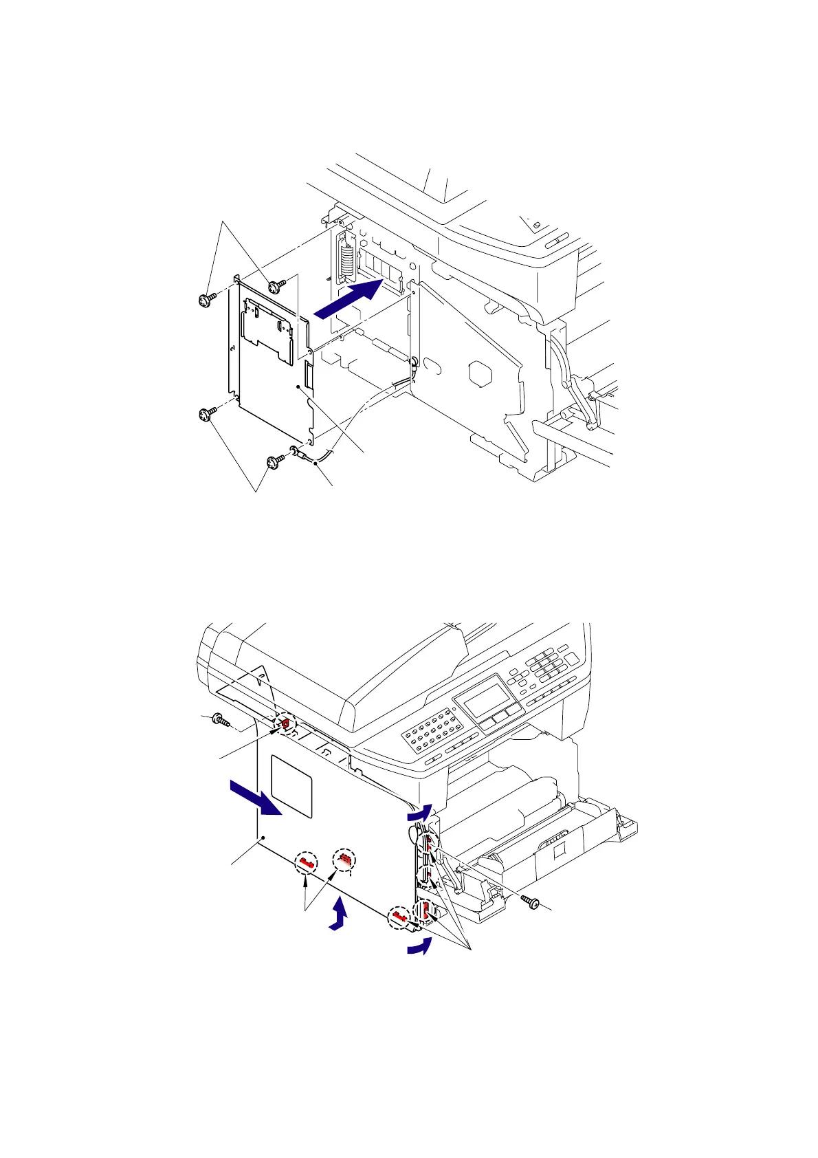 (26) Catch the Hooks in the order of the arrows and secure the Side cover L with the two bind B