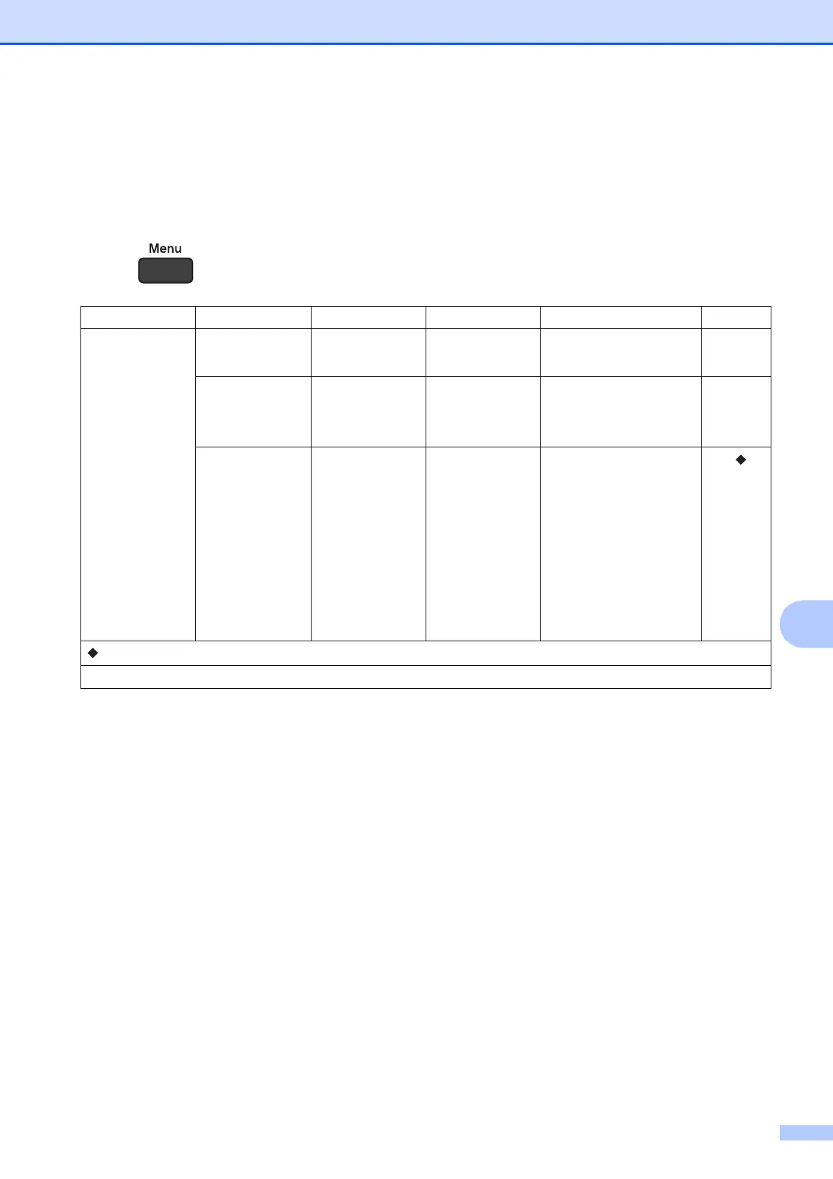 This menu table will help you understand the menu selections and options in the machine's LCD