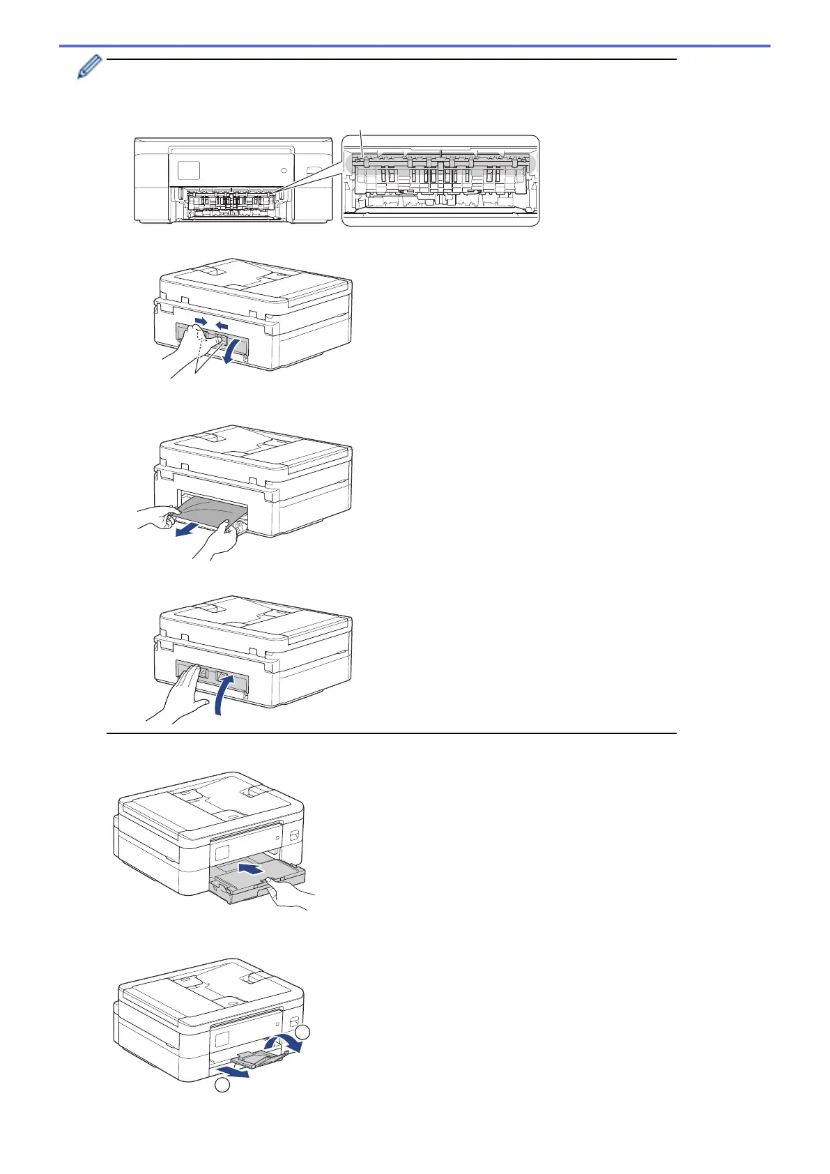 b. Squeeze both levers (1), and then open the Jam Clear Cover at the back of the machine.