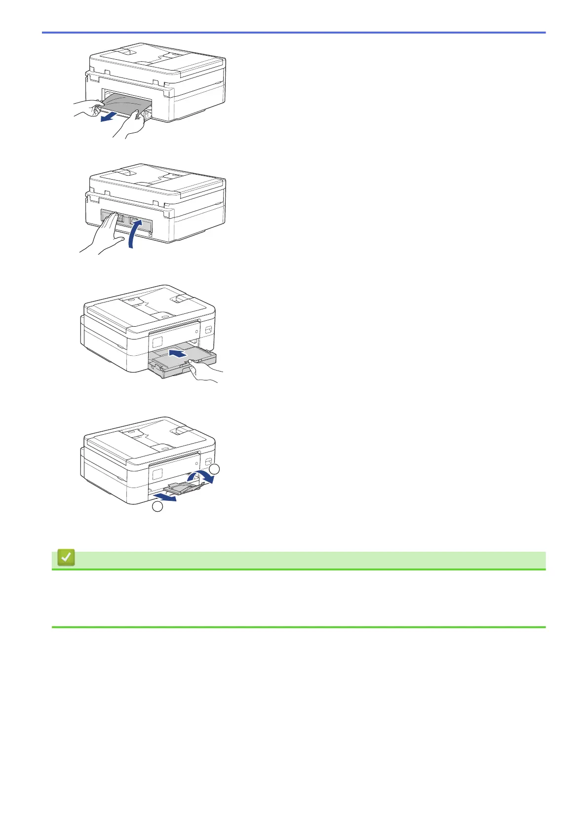 8. Pull out the paper support (1) until it locks into place, and then unfold the paper support flap (2).