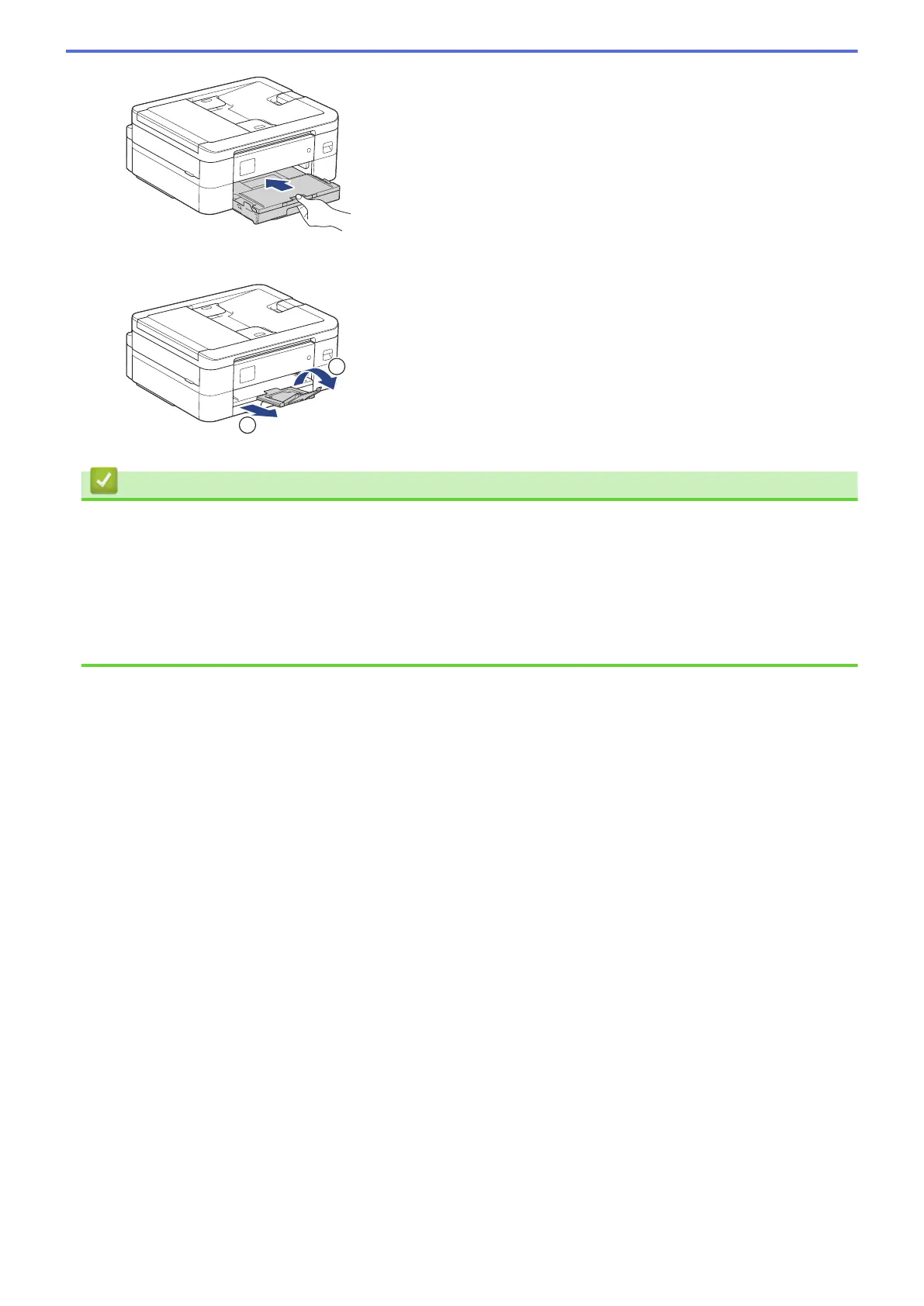 8. Pull out the paper support (1) until it locks into place, and then unfold the paper support flap (2).
