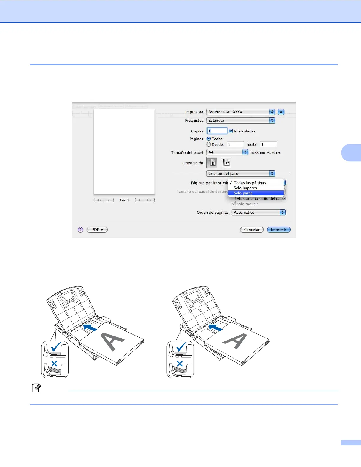 b Seleccione Solo pares en Páginas por imprimir, asegúrese de que Automático está seleccionado en