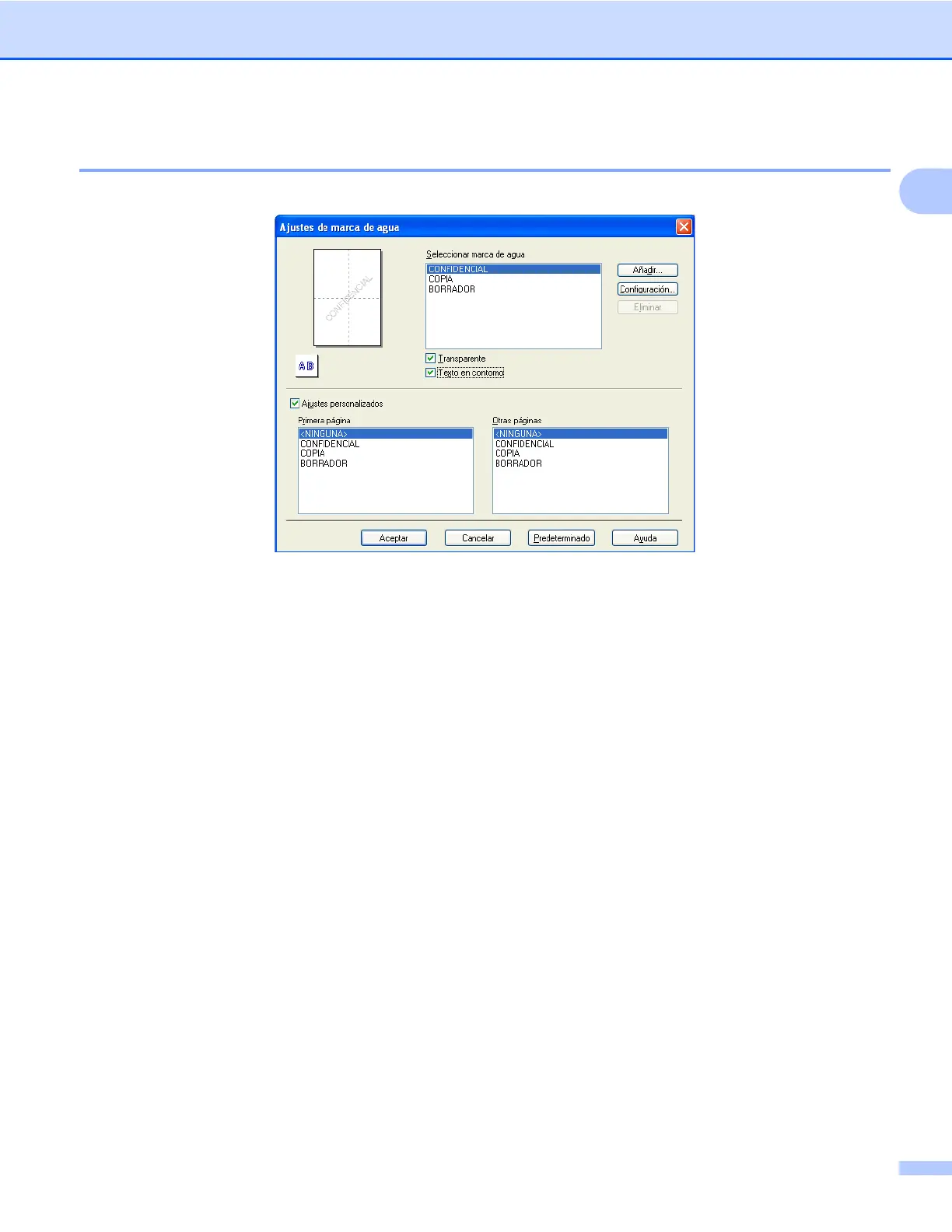 Puede seleccionar una marca de agua para imprimirla en la primera página o en otras páginas.