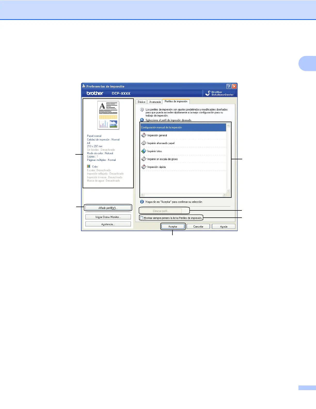 3 Casilla de verificación Mostrar siempre primero la ficha Perfiles de impresión