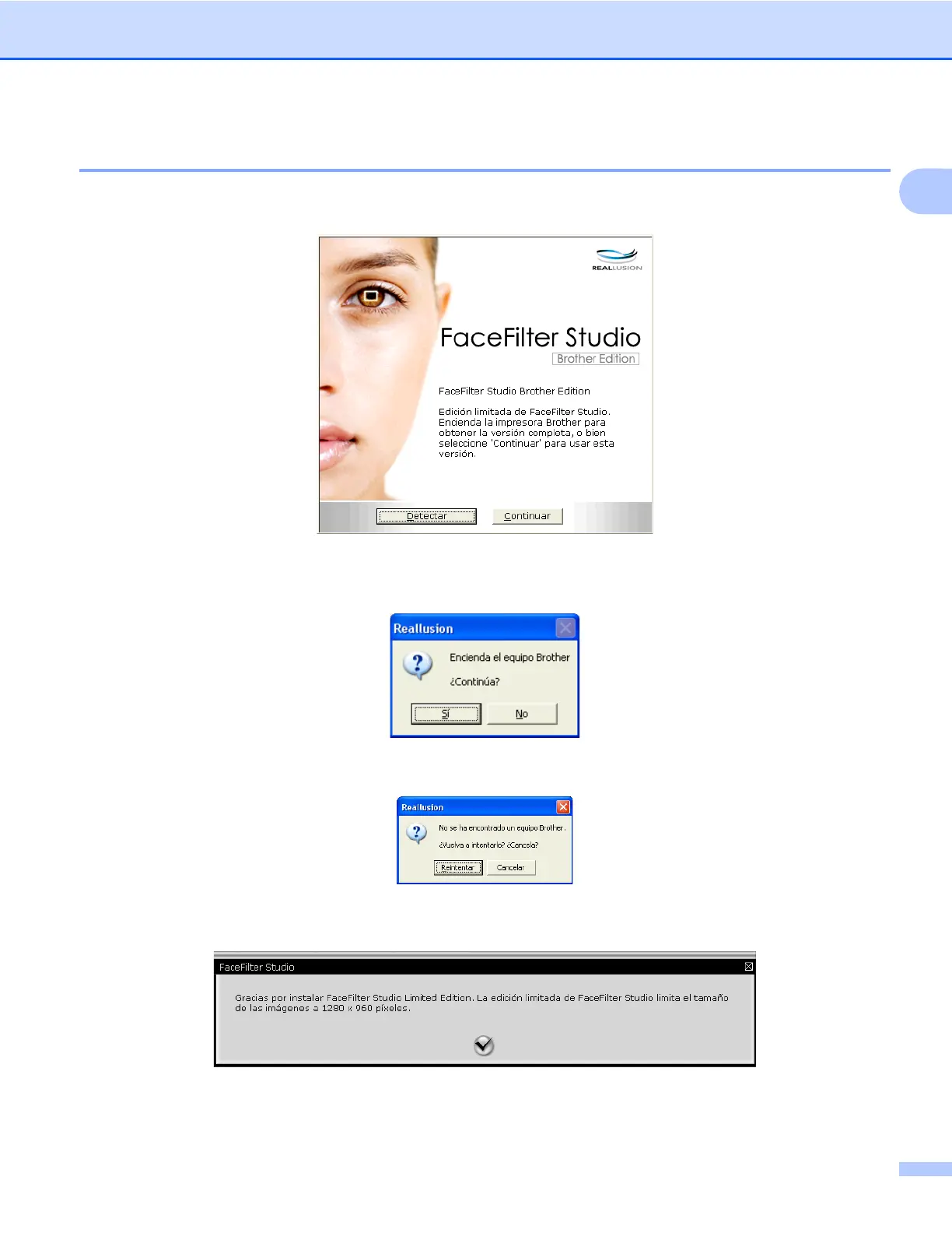 c Si FaceFilter Studio no detecta el equipo Brother, aparecerá esta pantalla.