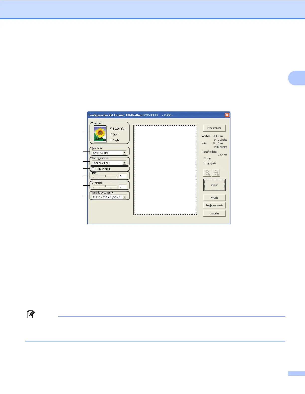 h Si fuese necesario, configure las siguientes opciones en el cuadro de diálogo Configuración del Escáner: