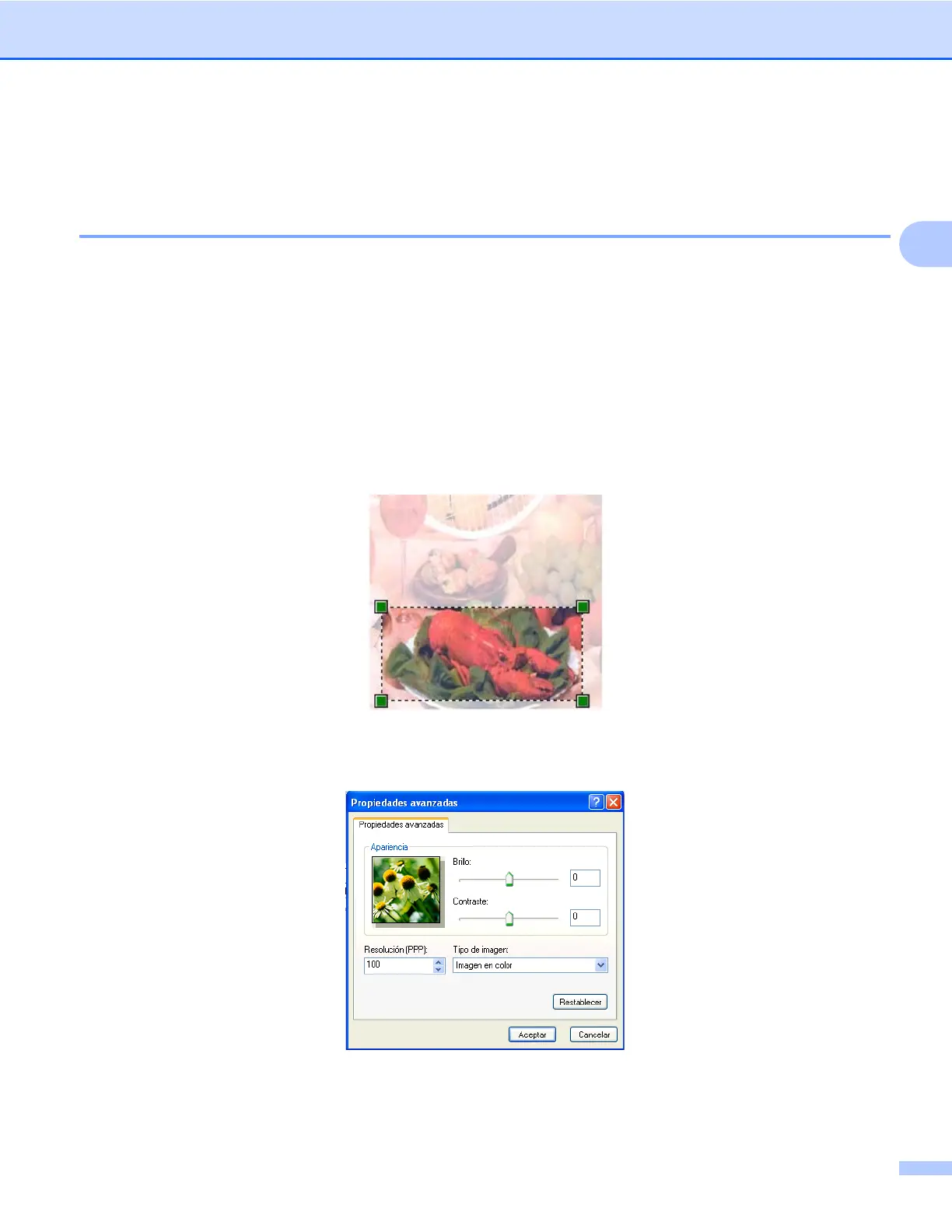 Puede elegir valores para Brillo, Contraste, Resolución y Tipo de imagen en Propiedades