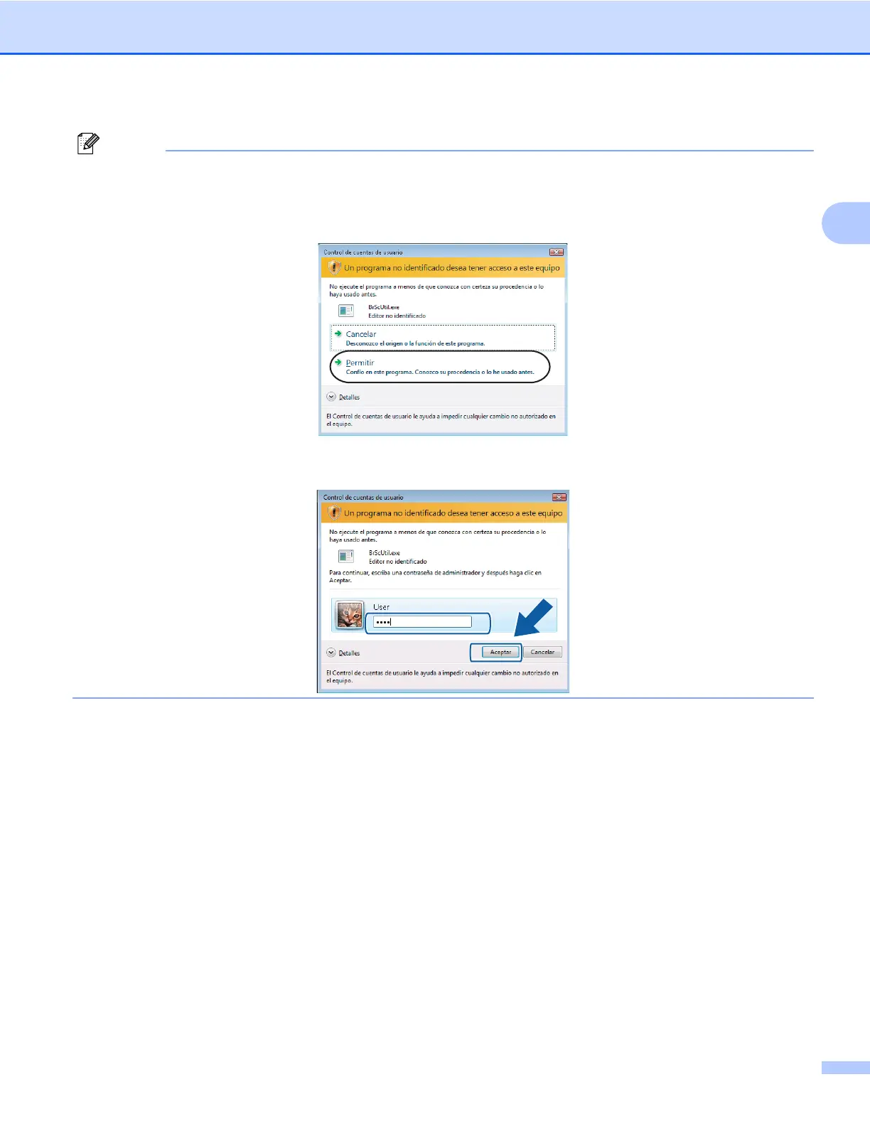 Para usuarios con derechos de administrador: haga clic en Permitir o .