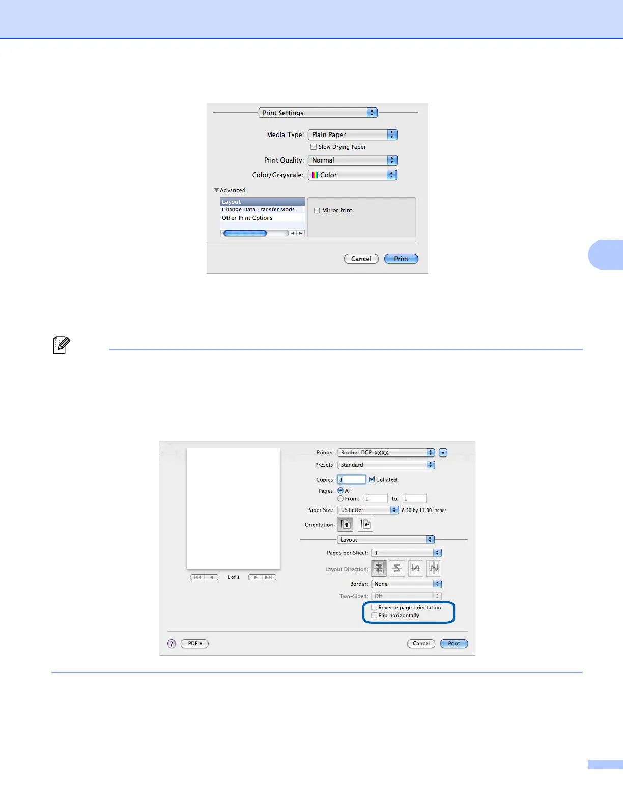 Mirror Print is shown as Flip horizontally in the Layout pop-up menu.