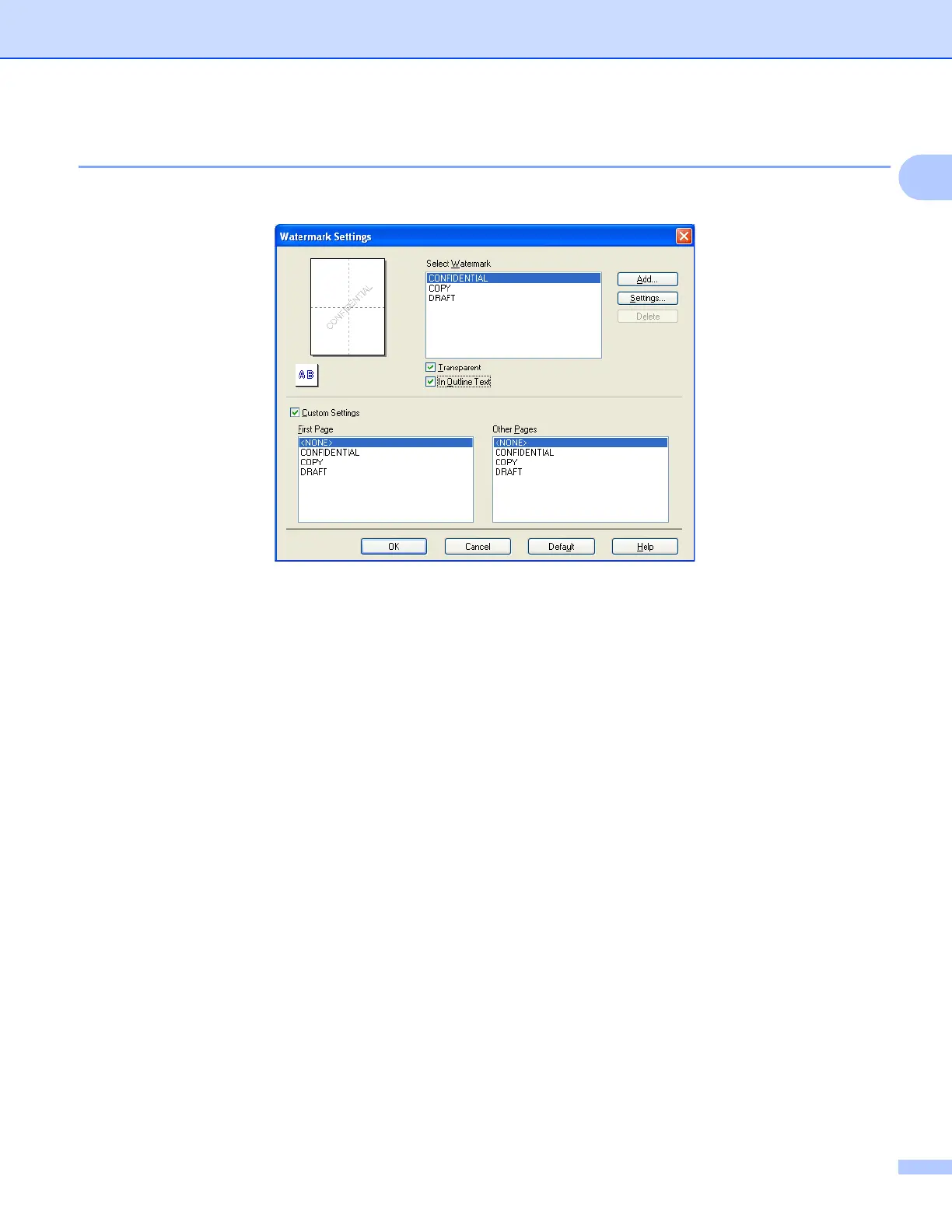 You can choose a watermark to be printed on the first page or on the other pages.
