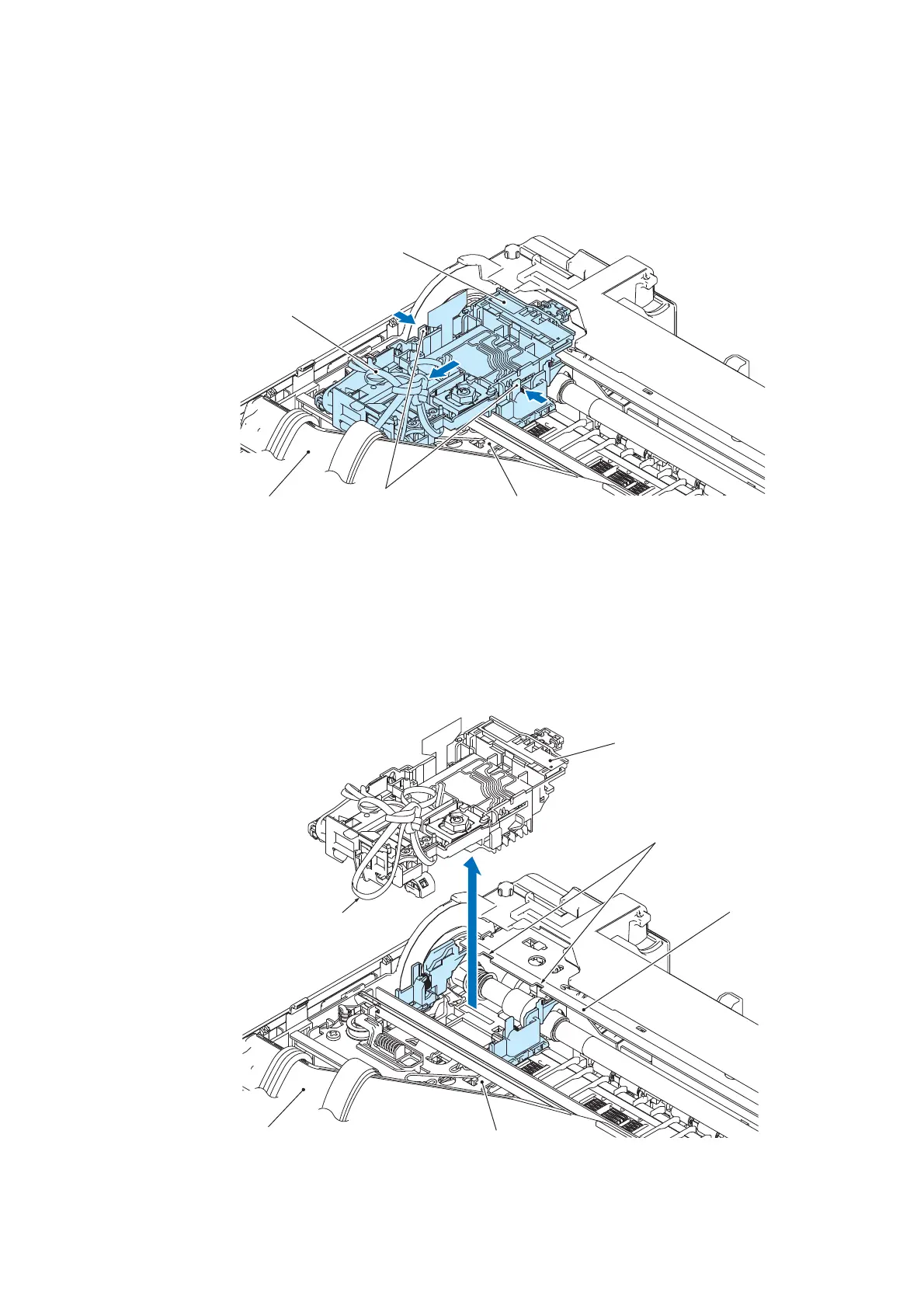 (21) Slightly lift the rear end of the head/carriage unit and detach it from the CR guide rail (through