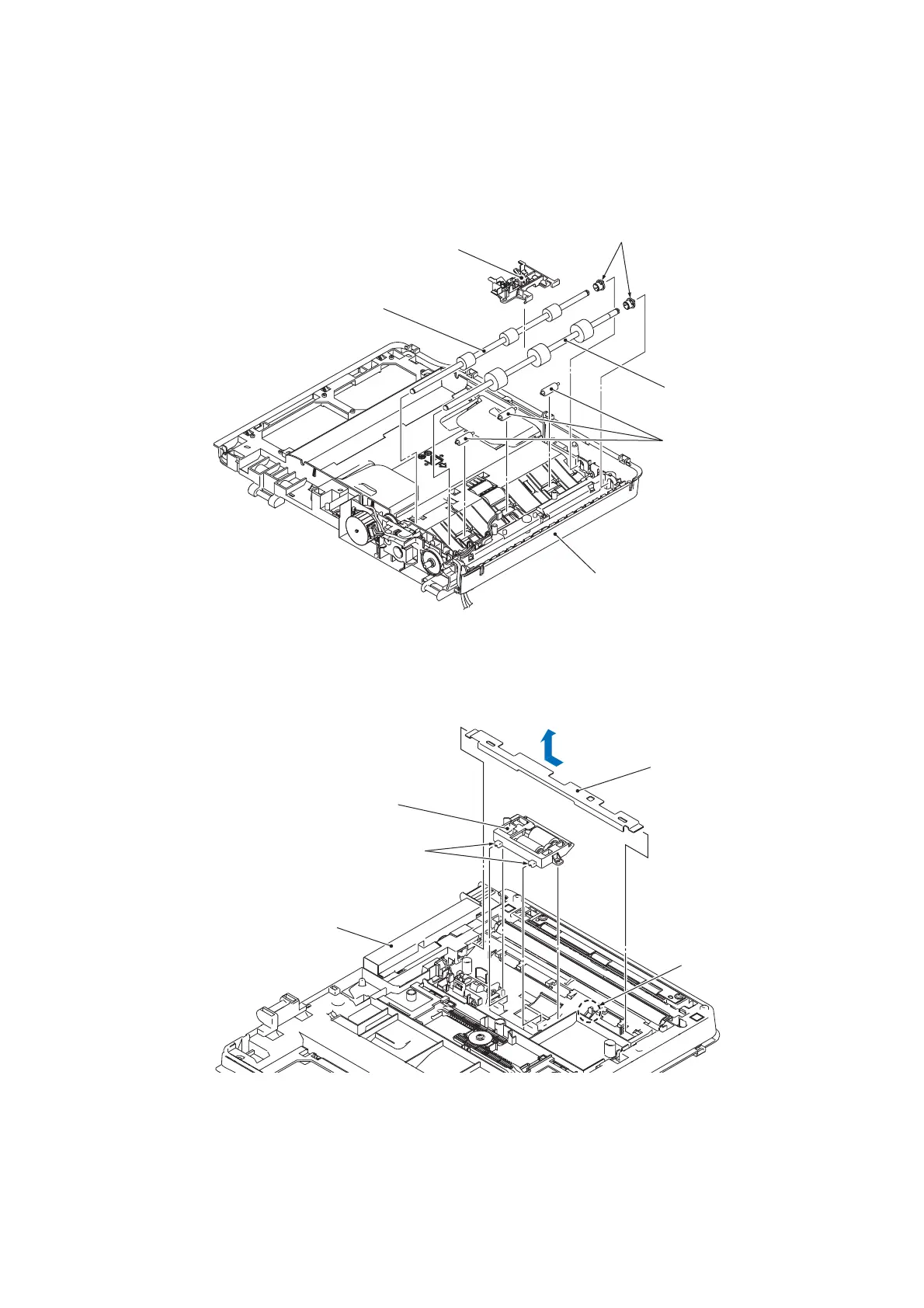 (21) Remove document feed roller 1 and 2 by pulling them away from bearings from then remove it