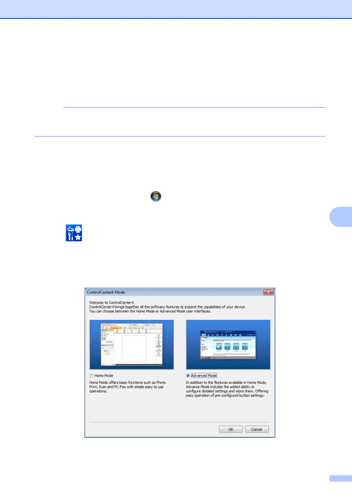 c If the ControlCenter4 Mode screen appears, choose the Advanced Mode, and then click