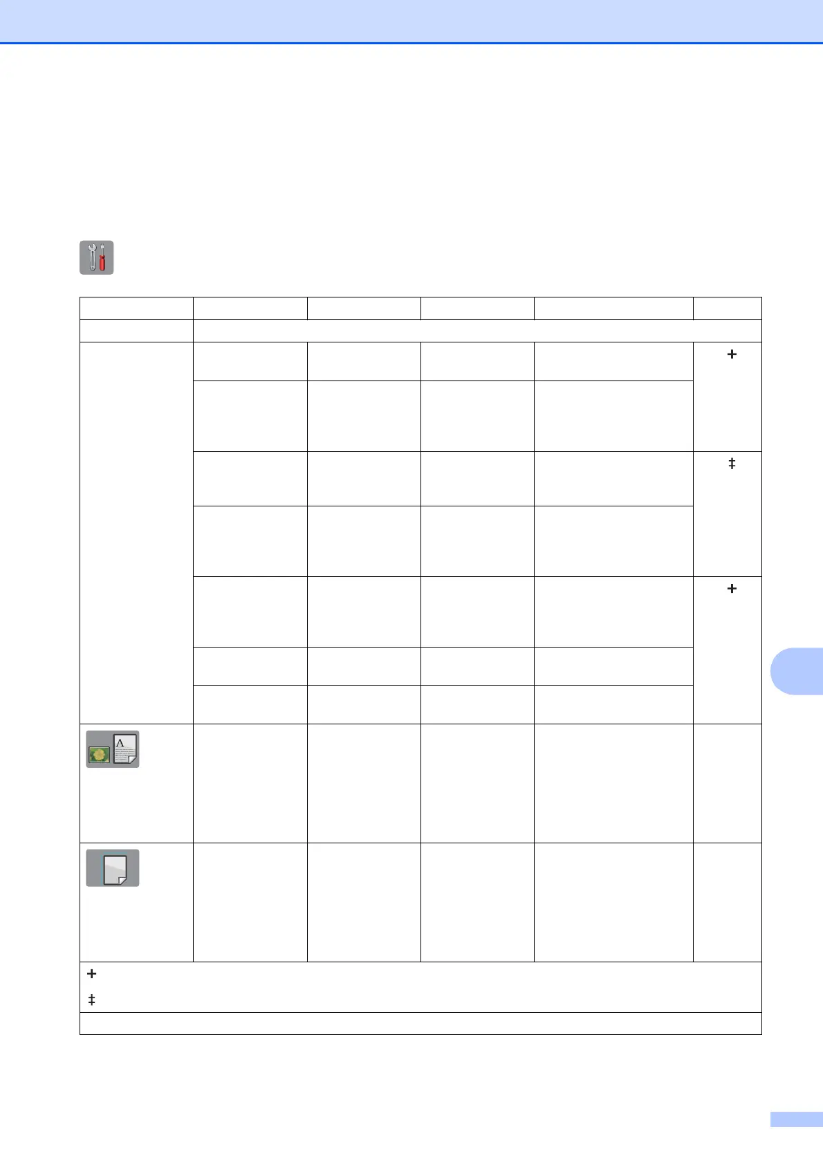 Settings and features tables