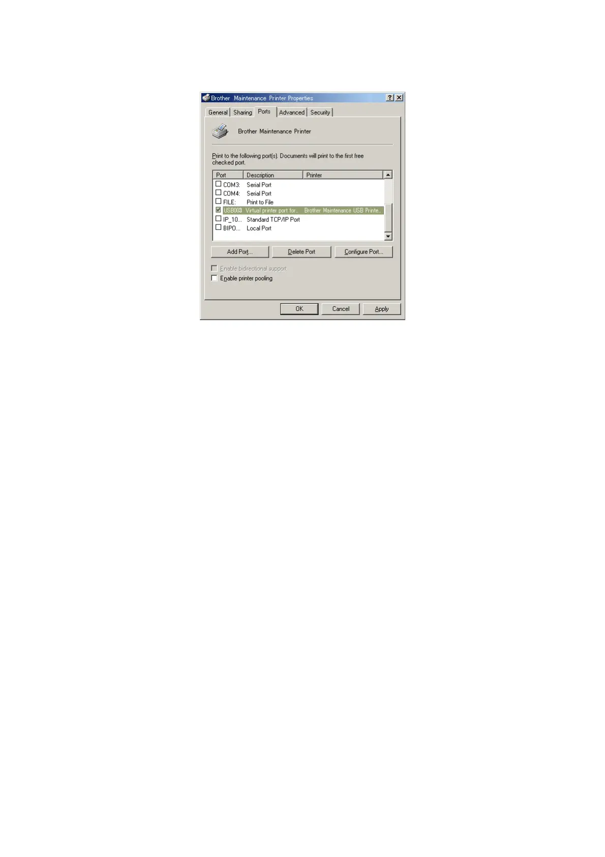 In this example, the port number assigned to the Brother Maintenance USB Printer is