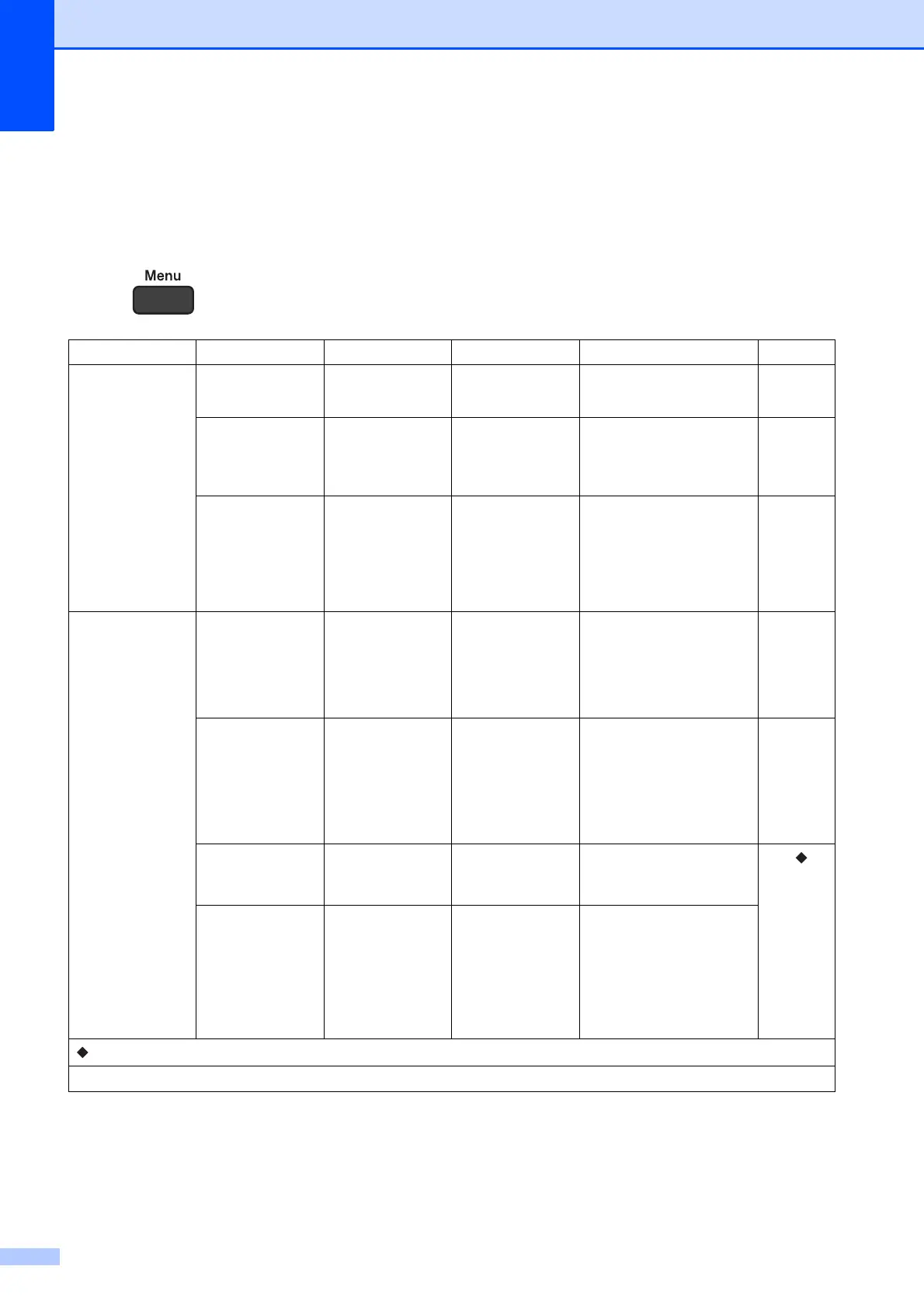 The menu table will help you understand the menu selections of your machine. The factory