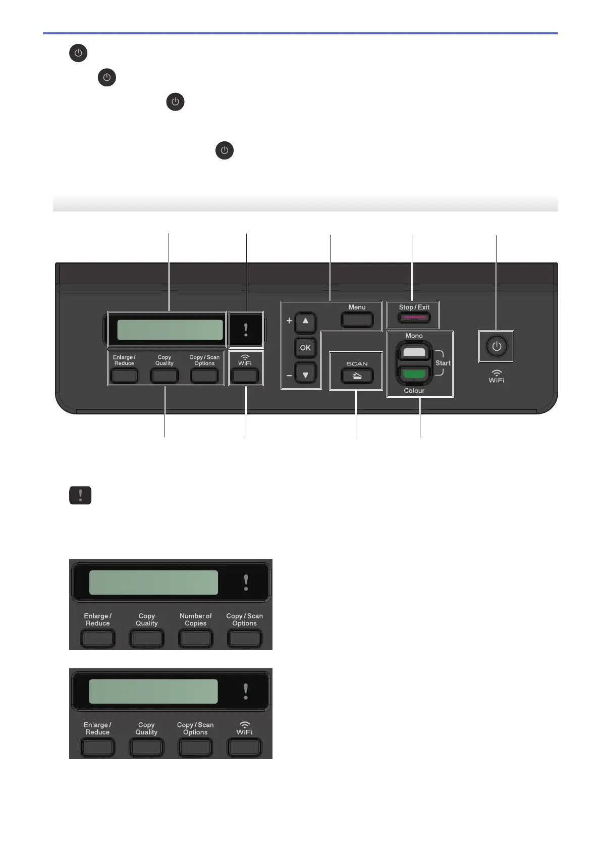 Blinks in orange when the LCD displays an error or an important status message.
