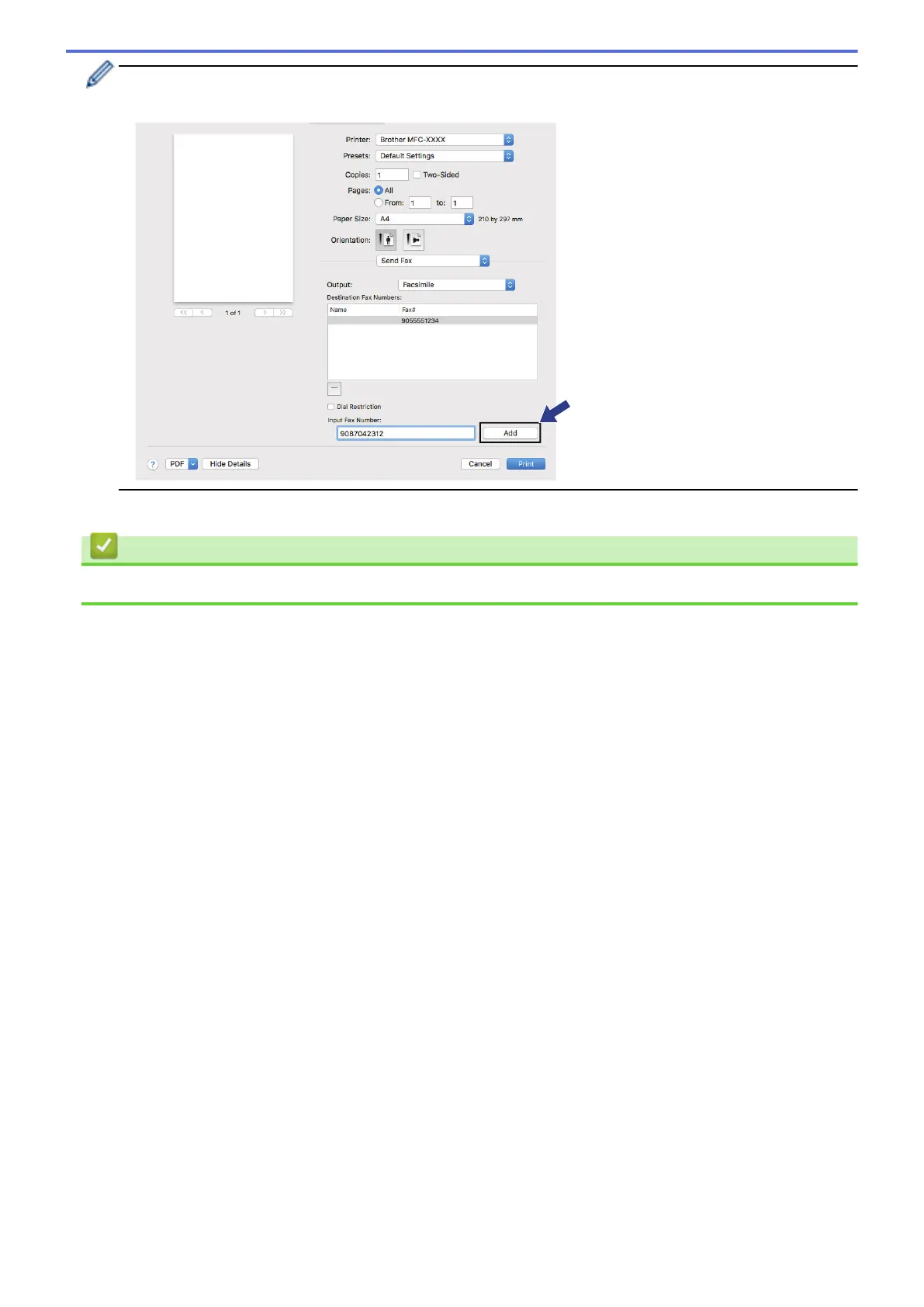 To send a fax to more than one number, click the Add button after entering the first fax number and type