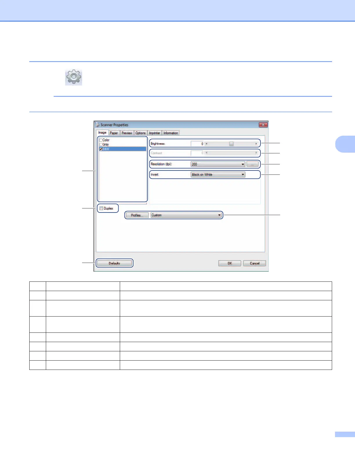 (7) Profiles Save or change the scan setting in the Scanner Properties dialog box.
