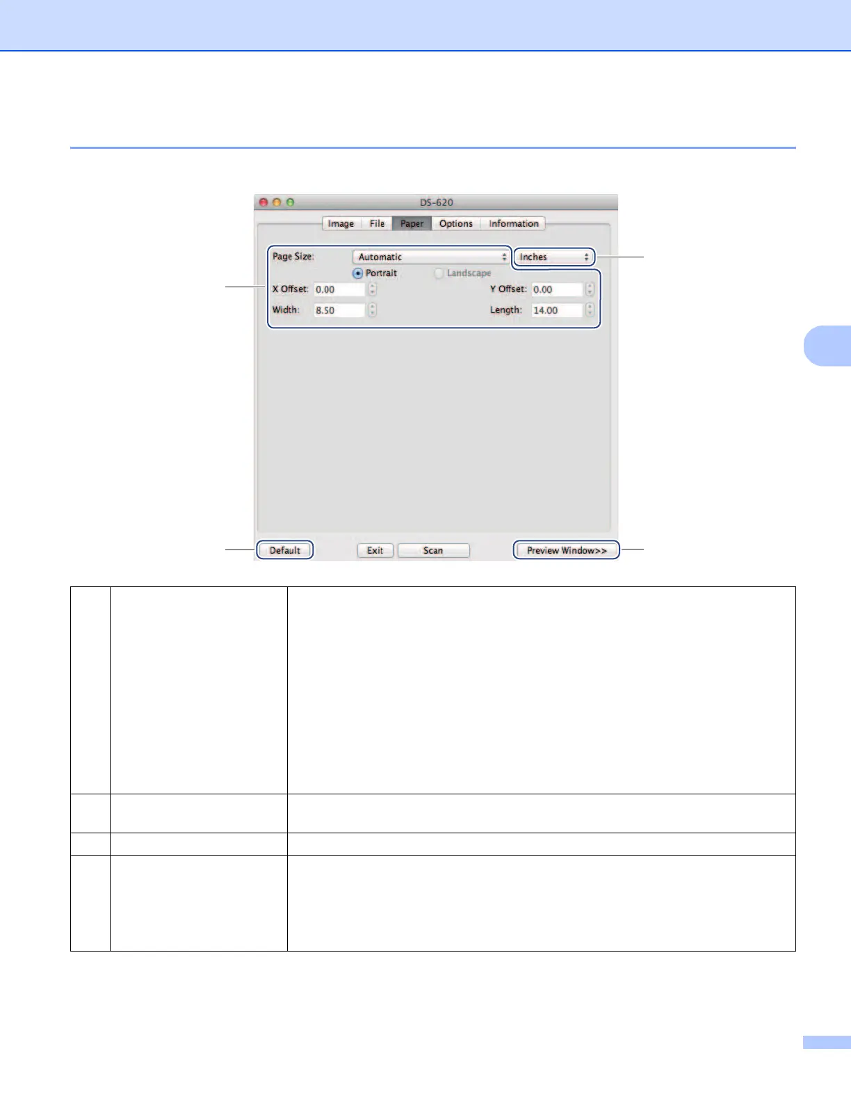 (1) Page Size Page Size allows you to capture a portion of the scanned document.