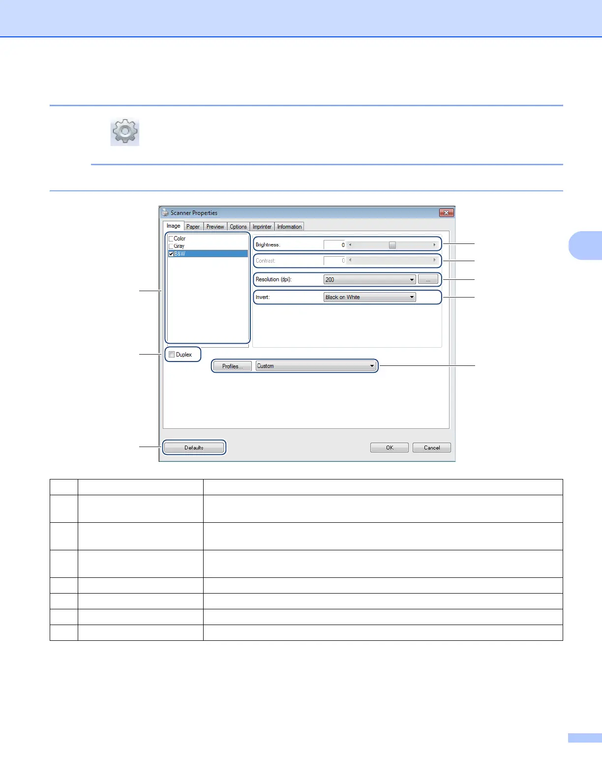 (7) Profiles Save or change the scanning setting in the dialog box of Scanner Properties.