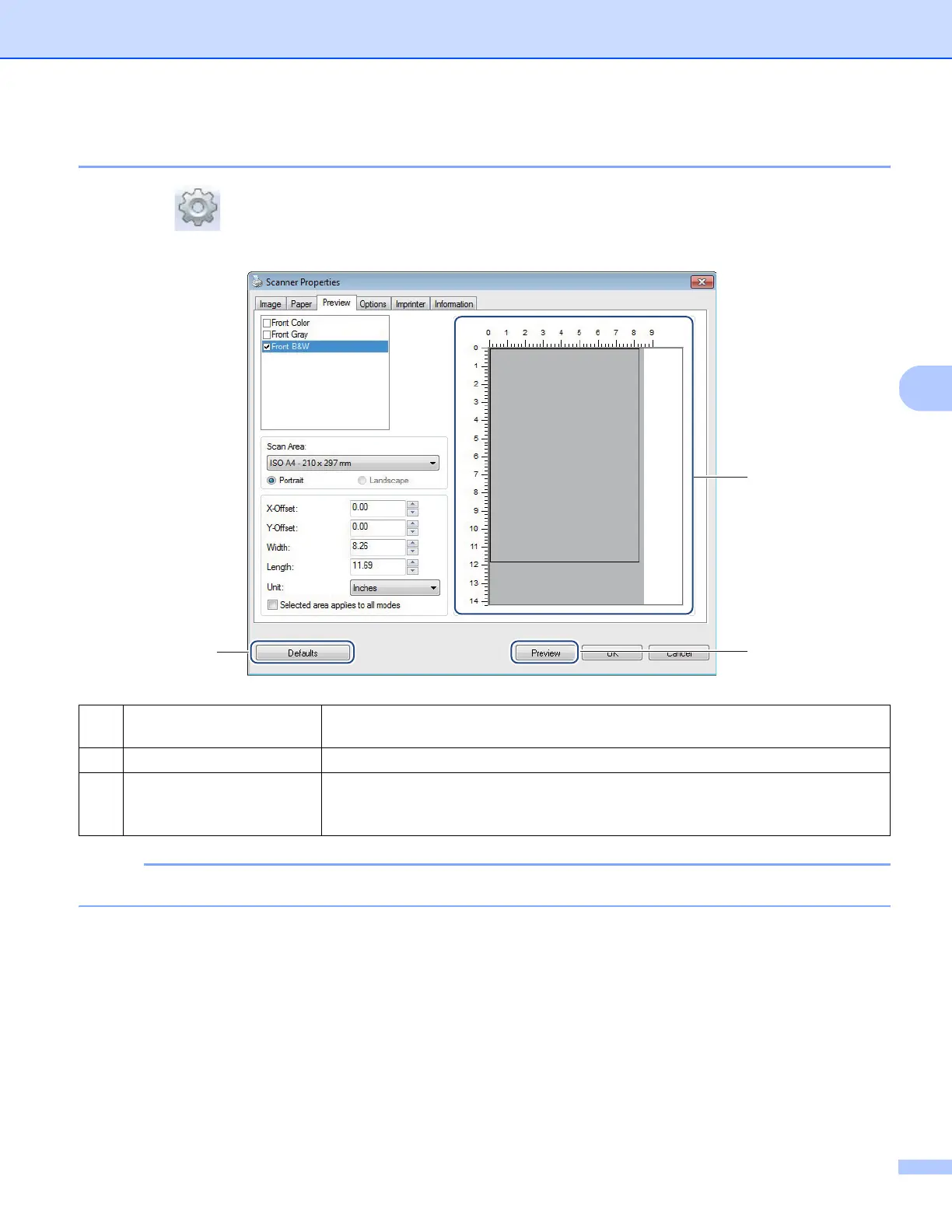 (3) Preview Click to start the preview scan. The scanned image will appear in the Preview