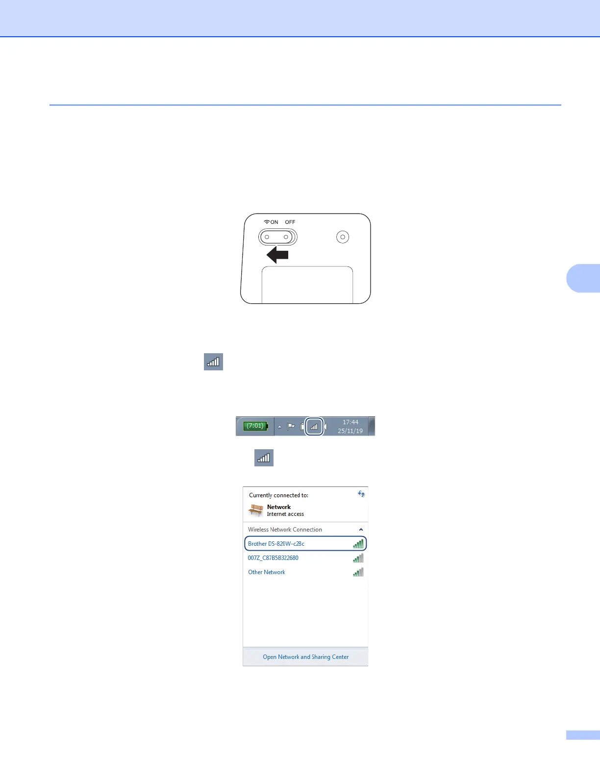 e On your computer, click the (Internet access) icon in the task tray. Your scanner’s SSID will appear