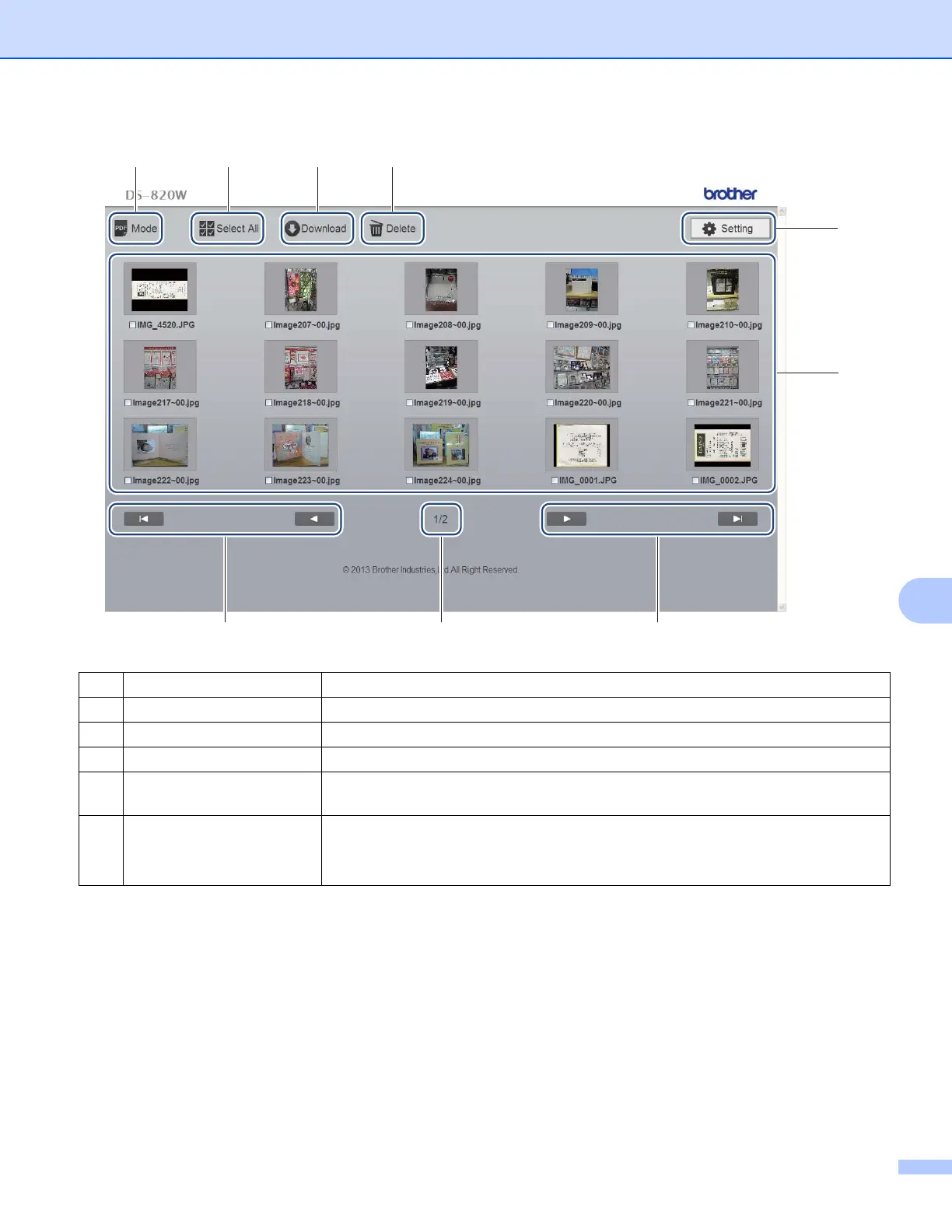 (6) Thumbnail view Displays the scanned images (up to 15 images per screen). When you double-