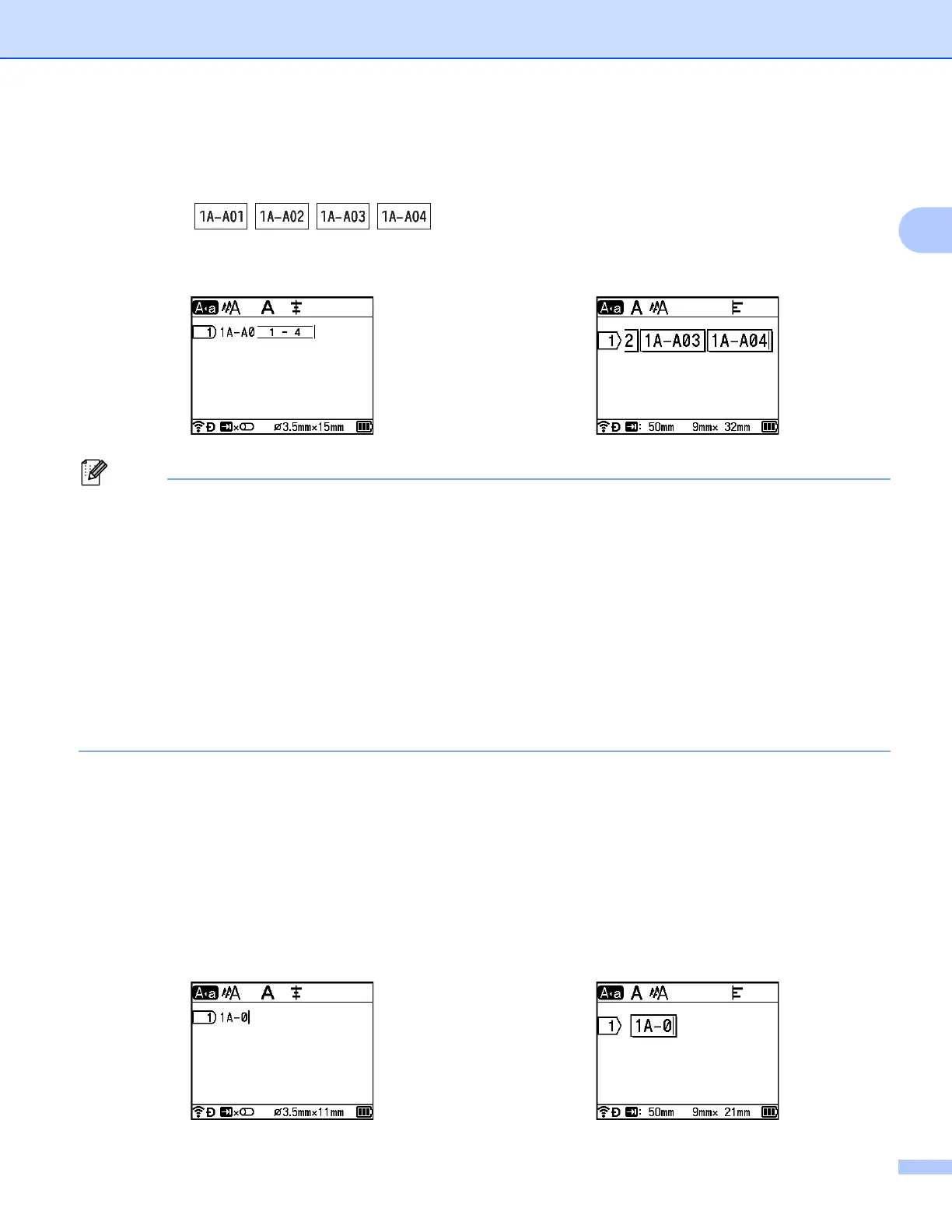 Example: Create tubes or labels 1A-A01, 1A-B02, 1A-C03, and 1A-D04 using this function. In this case,