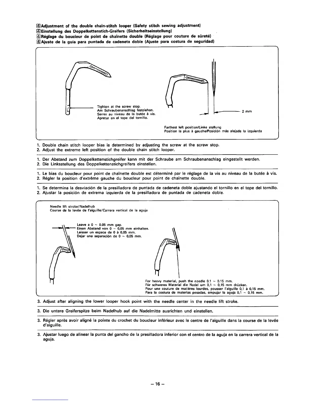 Double chain stitch looper bias is determined by adjusting the screw at the screw stop.