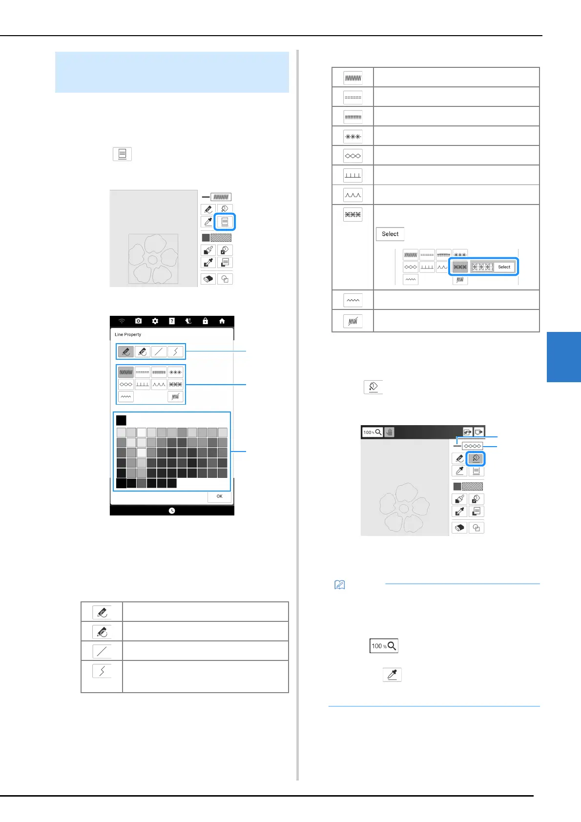 1 Touch to set the line types, stitch