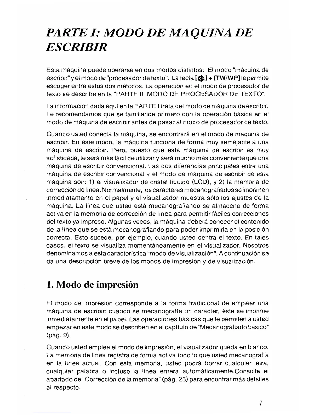 Brother GX-9750 - PARTE I: MODO DE MAQUINA DE ESCRIBIR; 1. Modo de impresin; 2. Modo de visualizacin