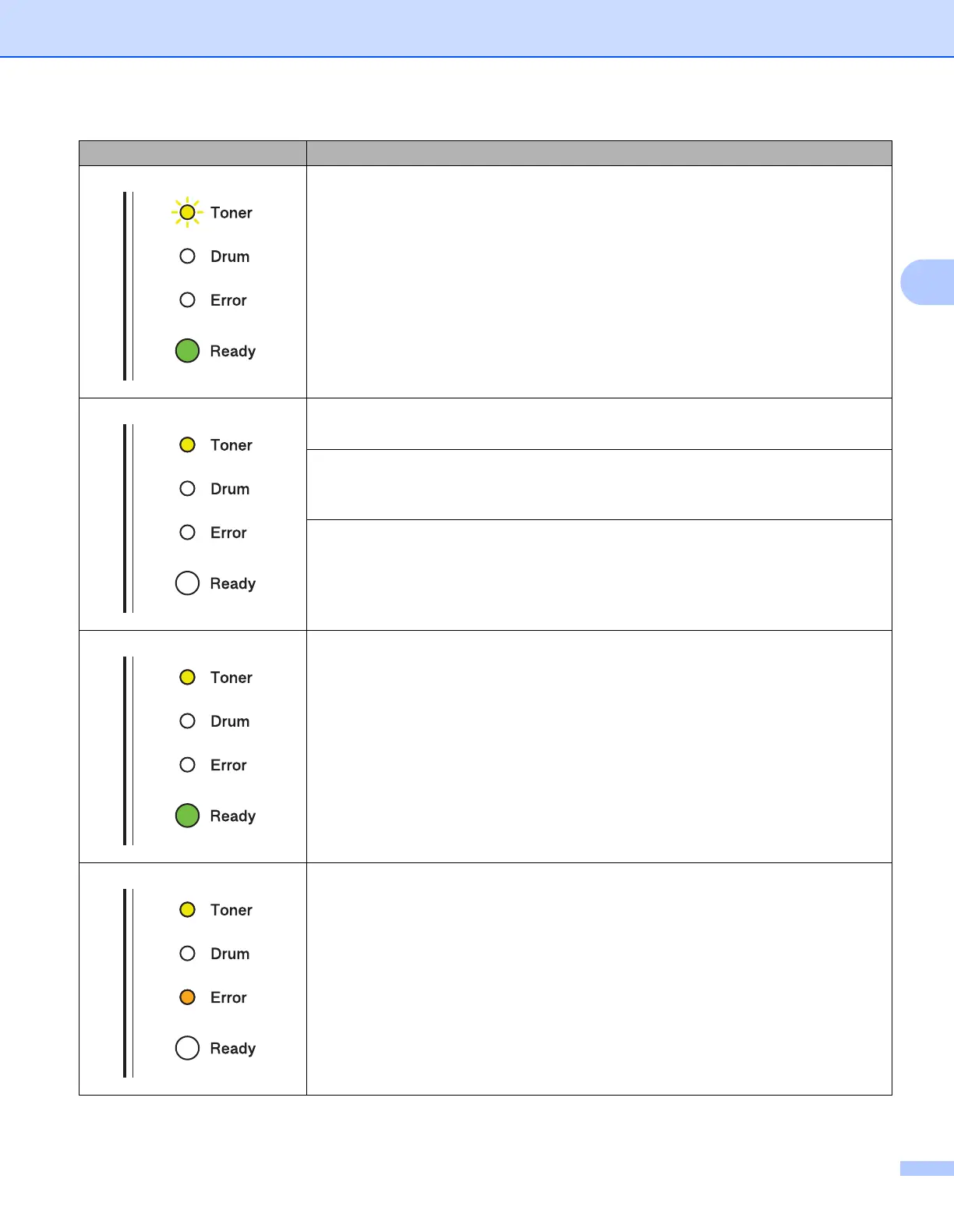 The Toner LED will turn on for 2 seconds and off for 3 seconds.