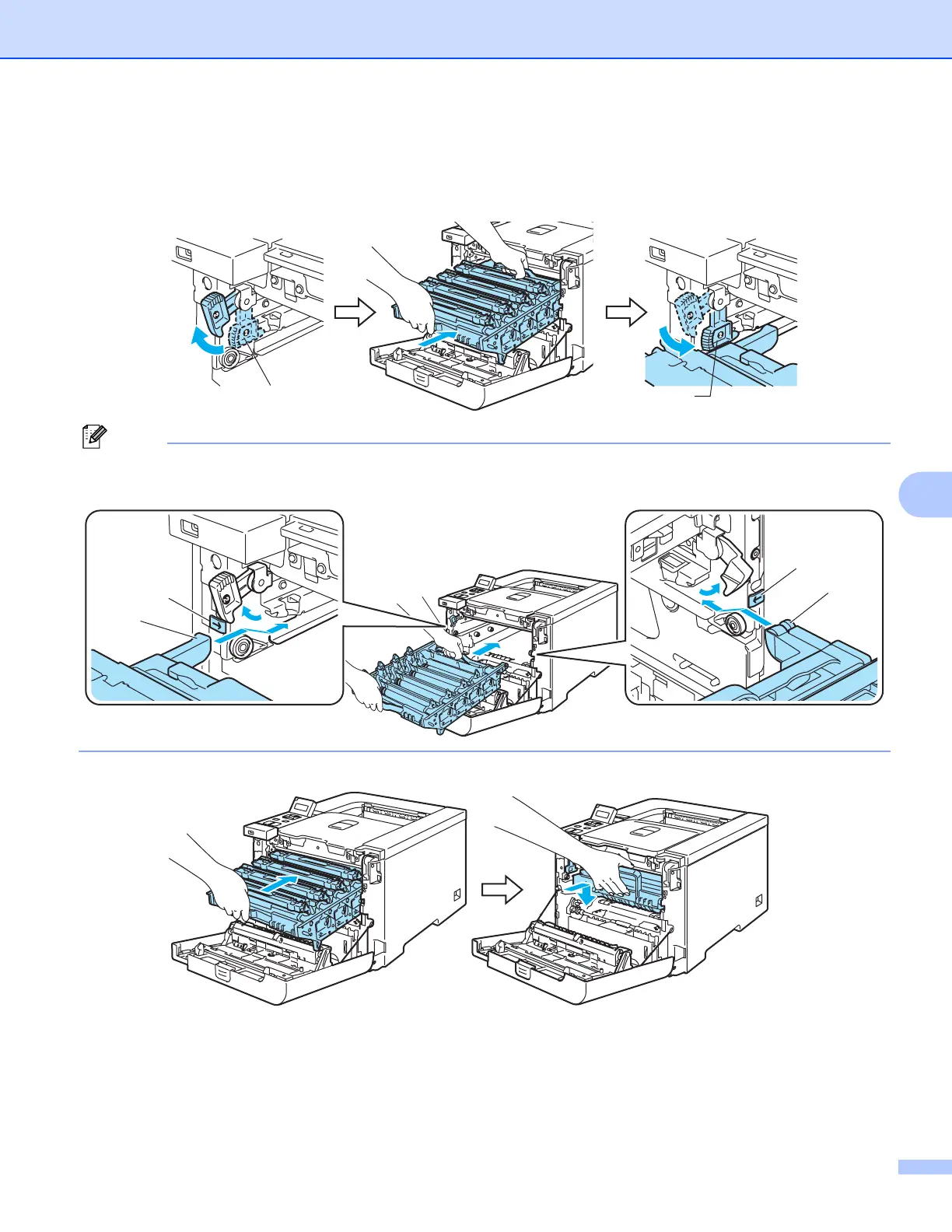 1 Make sure that the gray lock lever (1) is in the up position and put the drum unit in the printer. Push