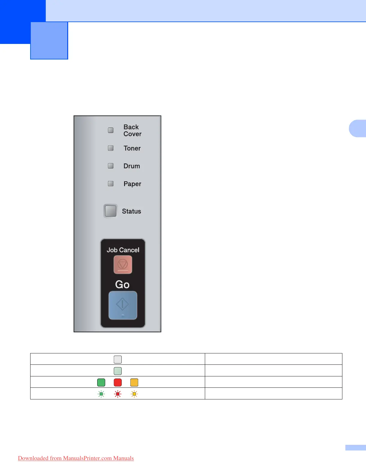 This section refers to five LEDs Back Cover, Toner, Drum, Paper, Status and two buttons Job Cancel and