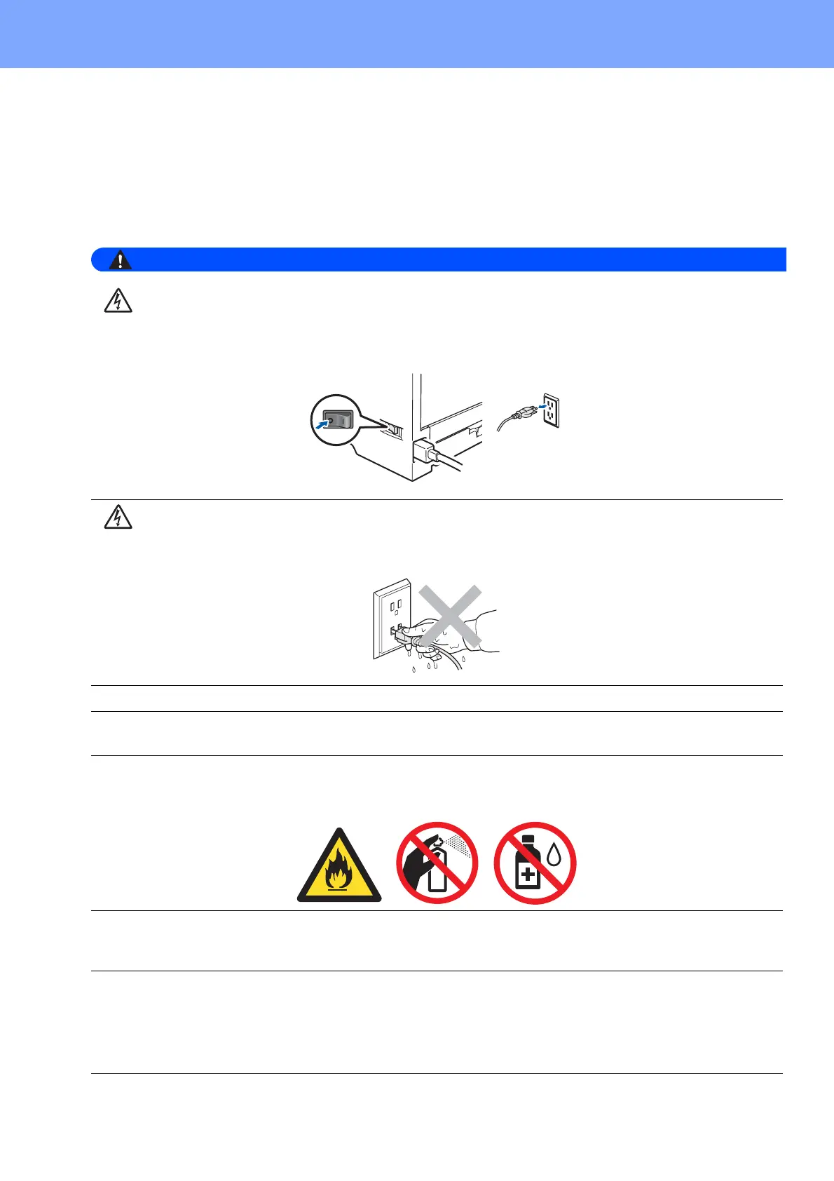 alcohol or ammonia to clean the inside or outside of the printer. Doing this may cause a fire or