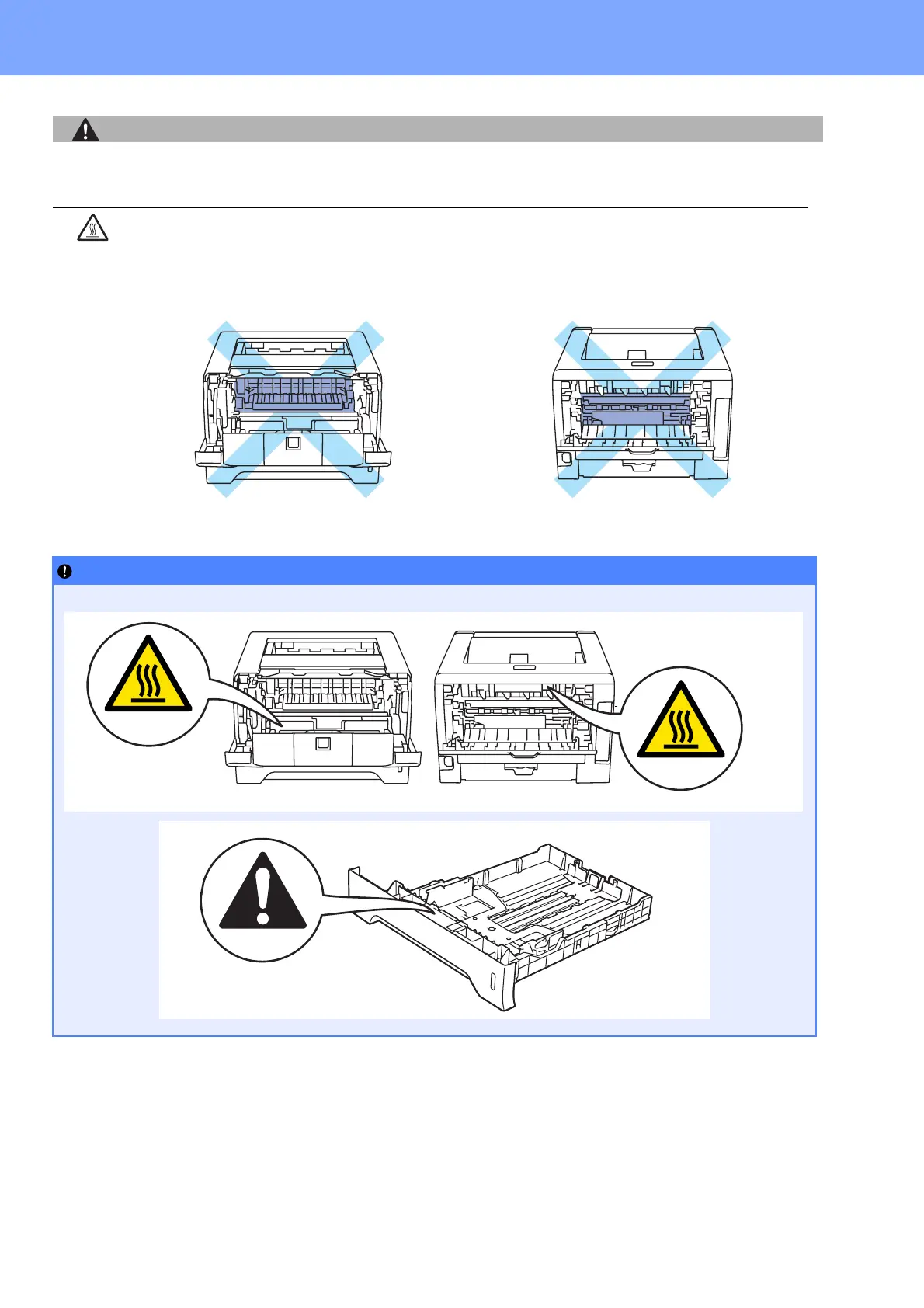 After you have just used the printer, some internal parts of the printer will be extremely hot. When you open