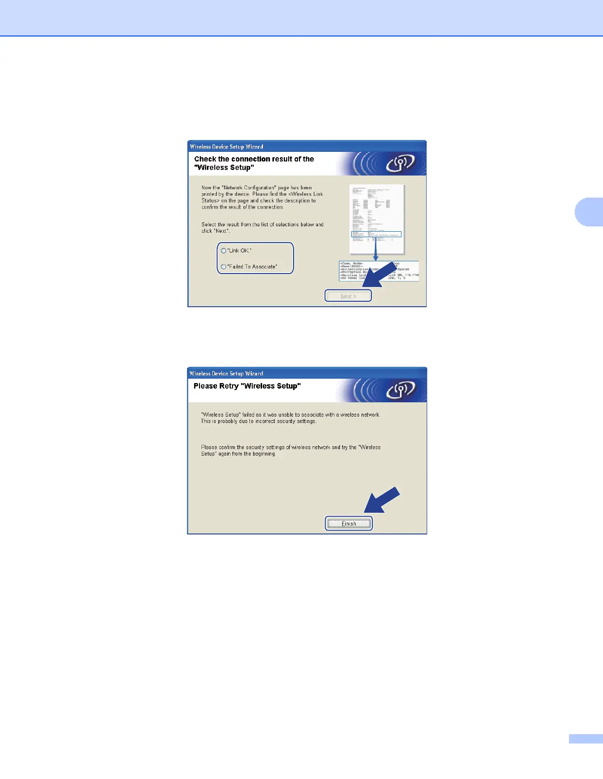 q Click Finish. Wireless setup was unable to associate with a wireless network. This is probably due to