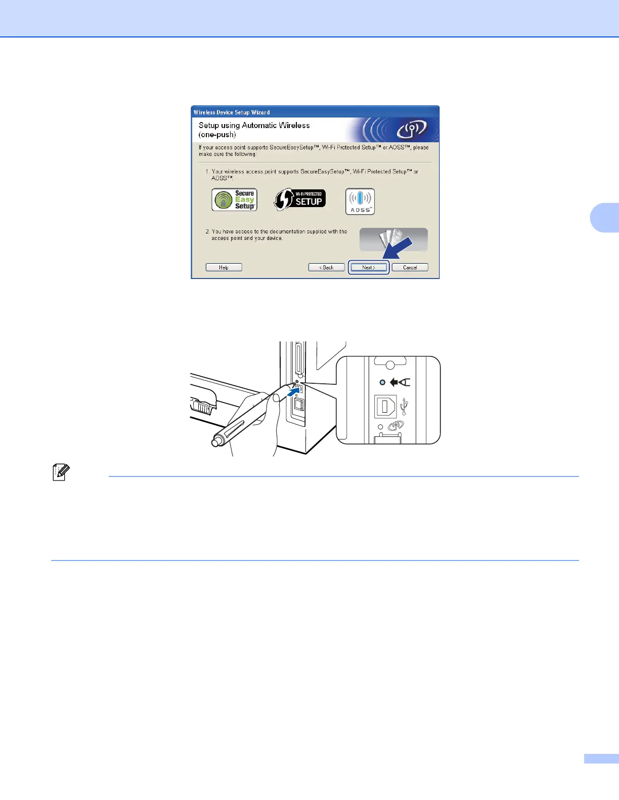 the illustration below. This will put the machine in one-push wireless setting mode. This feature will