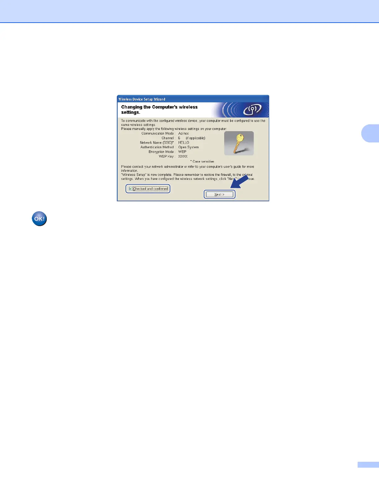wireless settings shown on this screen. Check the box after you confirm these settings, and then click