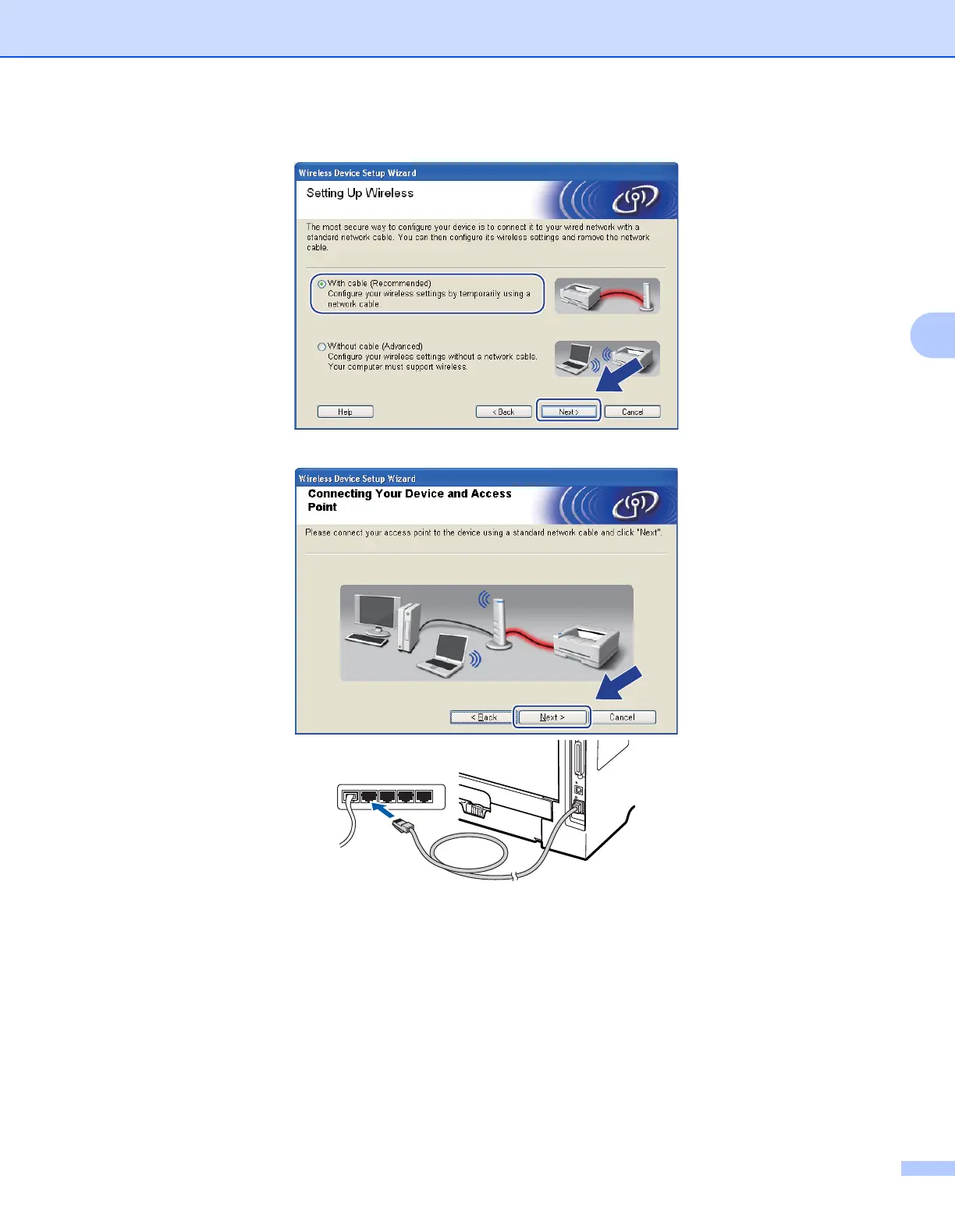 j Connect the Brother wireless device to your access point using a network cable and click Next.