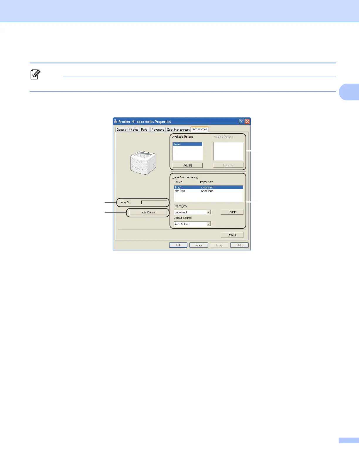 By clicking Auto Detect (4), the printer driver will probe the machine and display its serial number. If it fails