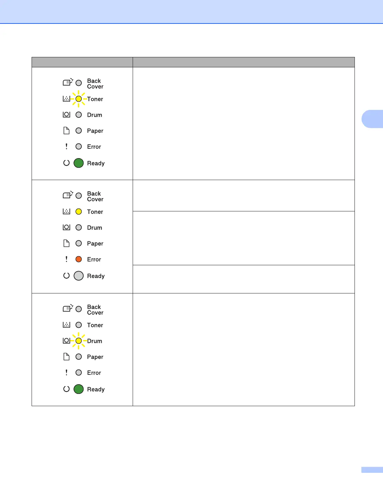 The Toner LED will turn on for 2 seconds and off for 3 seconds.